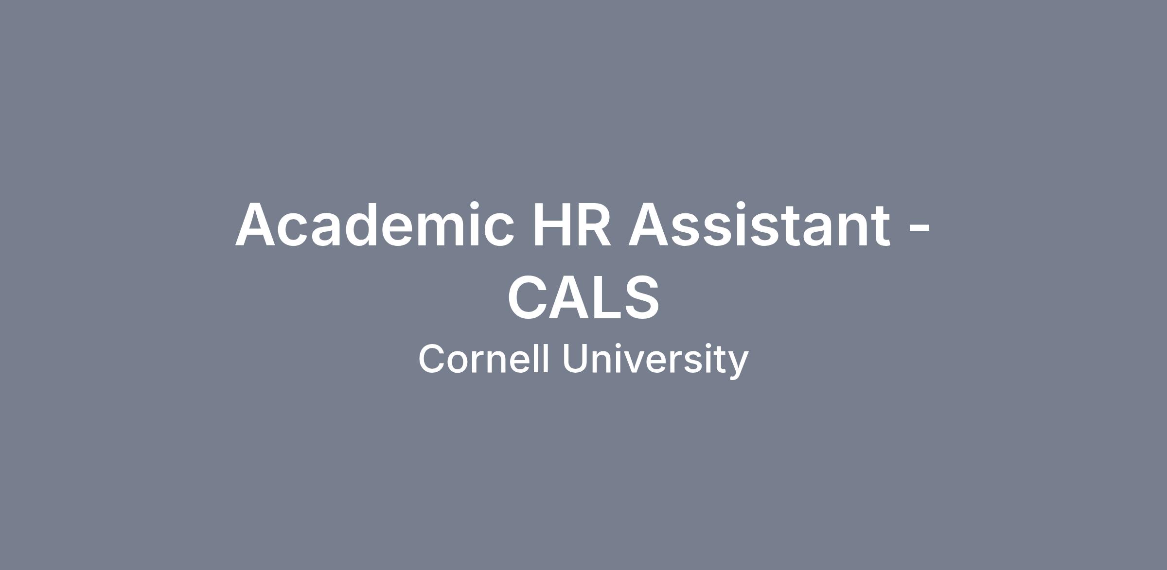 In a team and service-oriented environment within the College of Agriculture and Life Sciences Human Resources Office, the Academic HR Assistant will provide day-to-day academic human resource consultation and advice to faculty, chairs, managers and staff in the College of Agriculture and Life Sciences. The HR Assistant will facilitate a full range of human resource activities for academic personnel, including job design and classification, recruiting strategies and processes, advertising and outreach, appointment, reappointment and promotion procedures, compensation ranges and practices, medical and family leaves, interpretation and application of human resource policies, laws and practices. The Academic HR Assistant develops effective working relationships with all members of the CALS, Engineering, Bowers/CIS, Human Ecology, Dyson School and ARTS community for those departments that have shared college appointments. The Academic HR Assistant must maintain strict confidentiality and will serve as primary contact for processing all visas for the College of Agriculture and Life Sciences for academic appointees.