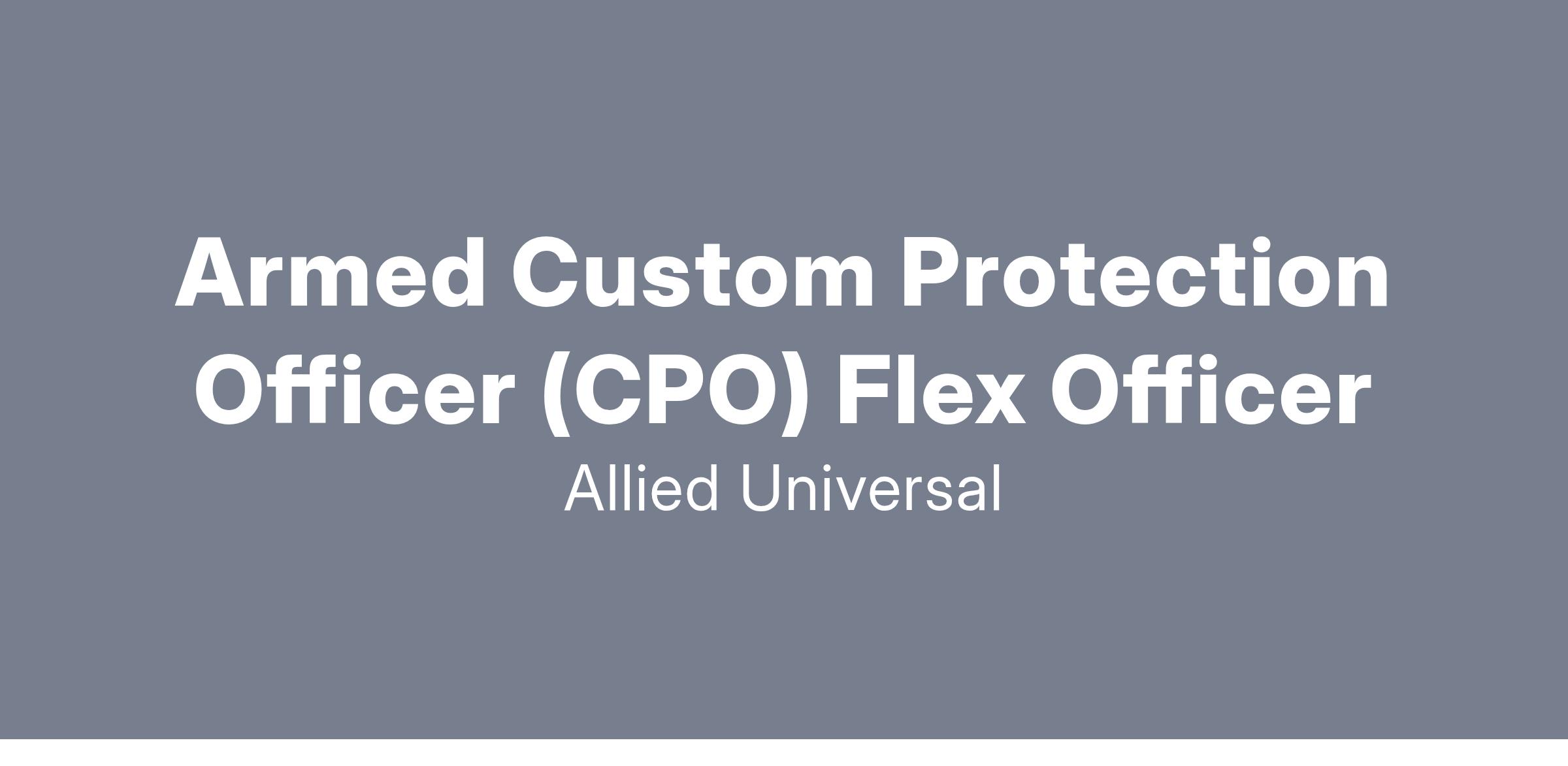 Allied Universal® is hiring a Armed Custom Protection Officer (CPO) Flex Officer. The Custom Protection Officer Flex Officer will conduct armed and/or unarmed foot and/or vehicle patrol (interior and/or exterior). Additional duties include control access and egress; monitor CCTV and alarm systems; compose reports; deter criminal activity and misconduct. The Custom Protection Flex Officer will work at various assignments and may be called upon to work irregular shifts at times with little to no advance notice.