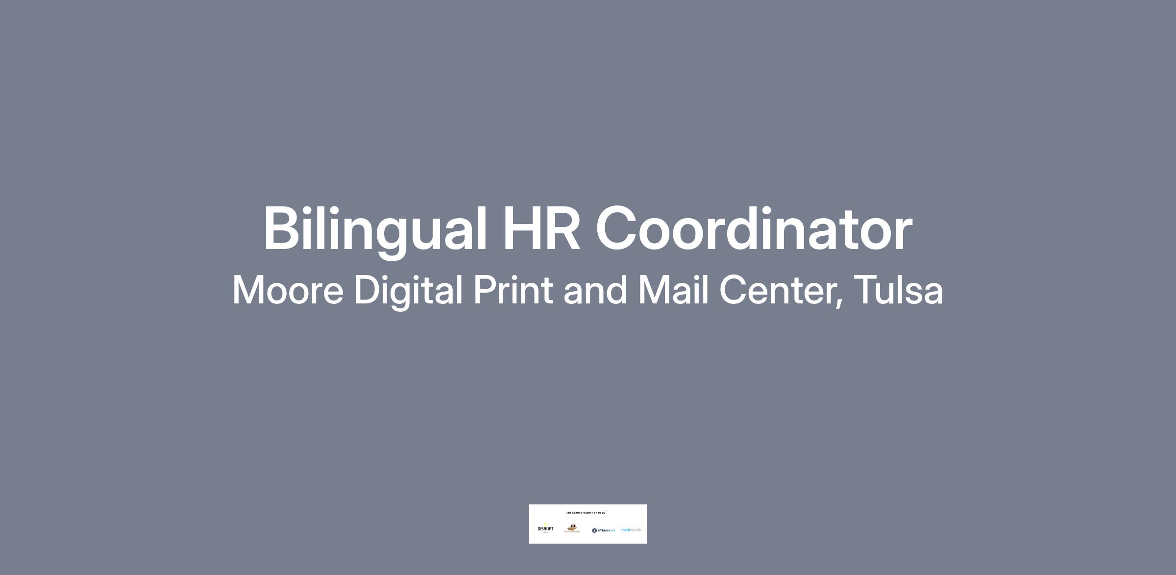 Moore Digital Print and Mail Center, Tulsa is looking for a Bilingual HR Coordinator. This is the ideal role for someone that desires to grow their HR skillset and wants to work with a high-performing team at an established company.