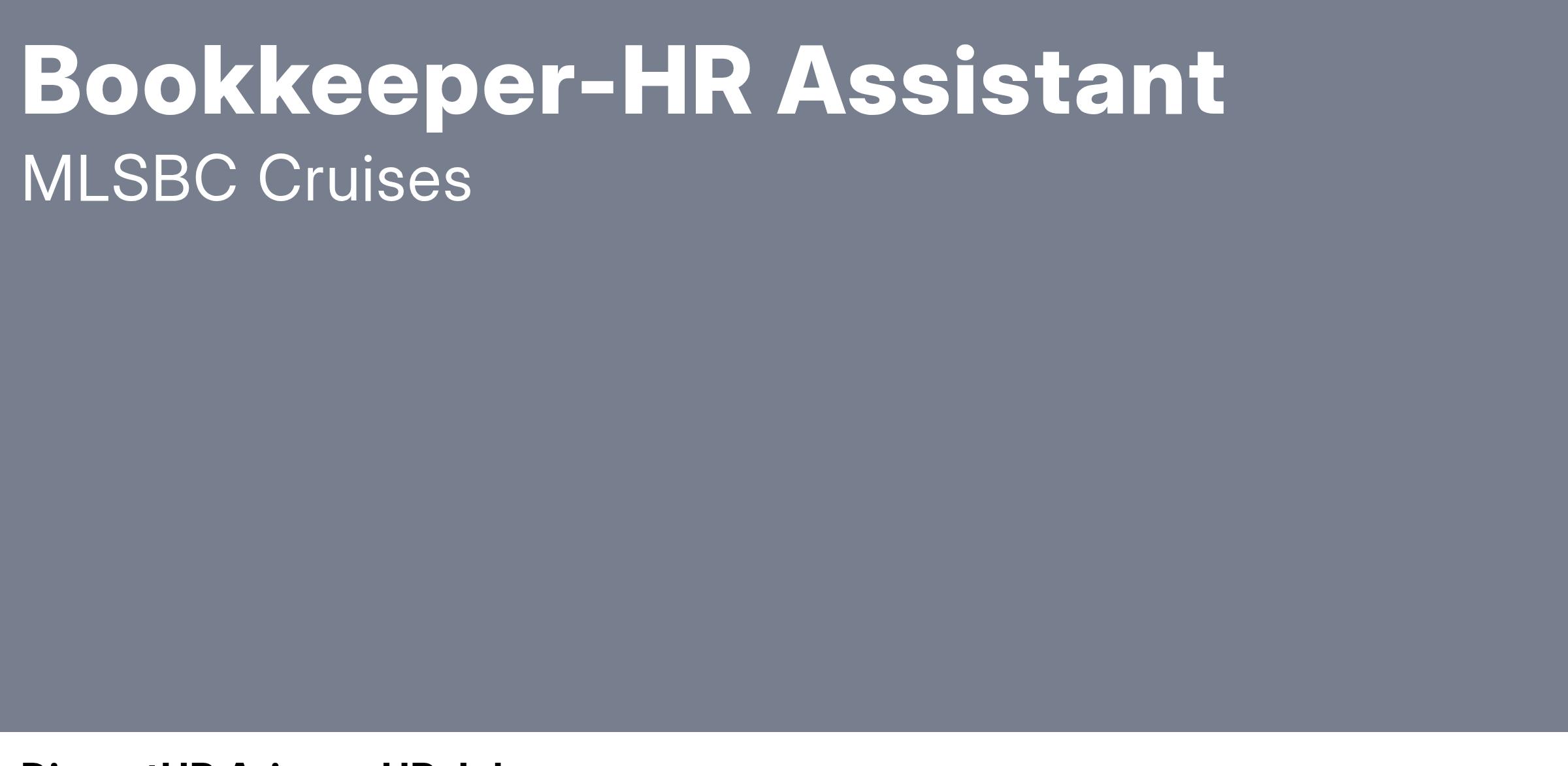 We are a growing company in the Cruise Industry looking for a Full-Time Bookkeeper-HR Assistant to join our Financial Office. We want you to show us your Invoicing, Payroll and HR skills. Must be proficient with Windows Laptops and Microsoft Office. Willing to learn about Worker's Compensation Claims and Employee Insurance. Additional Accounting-Bookkeeping Courses a plus.We need an individual who is accurate, efficient and comfortable being a member of a Team. Excel experience is vital. High School Diploma required.
