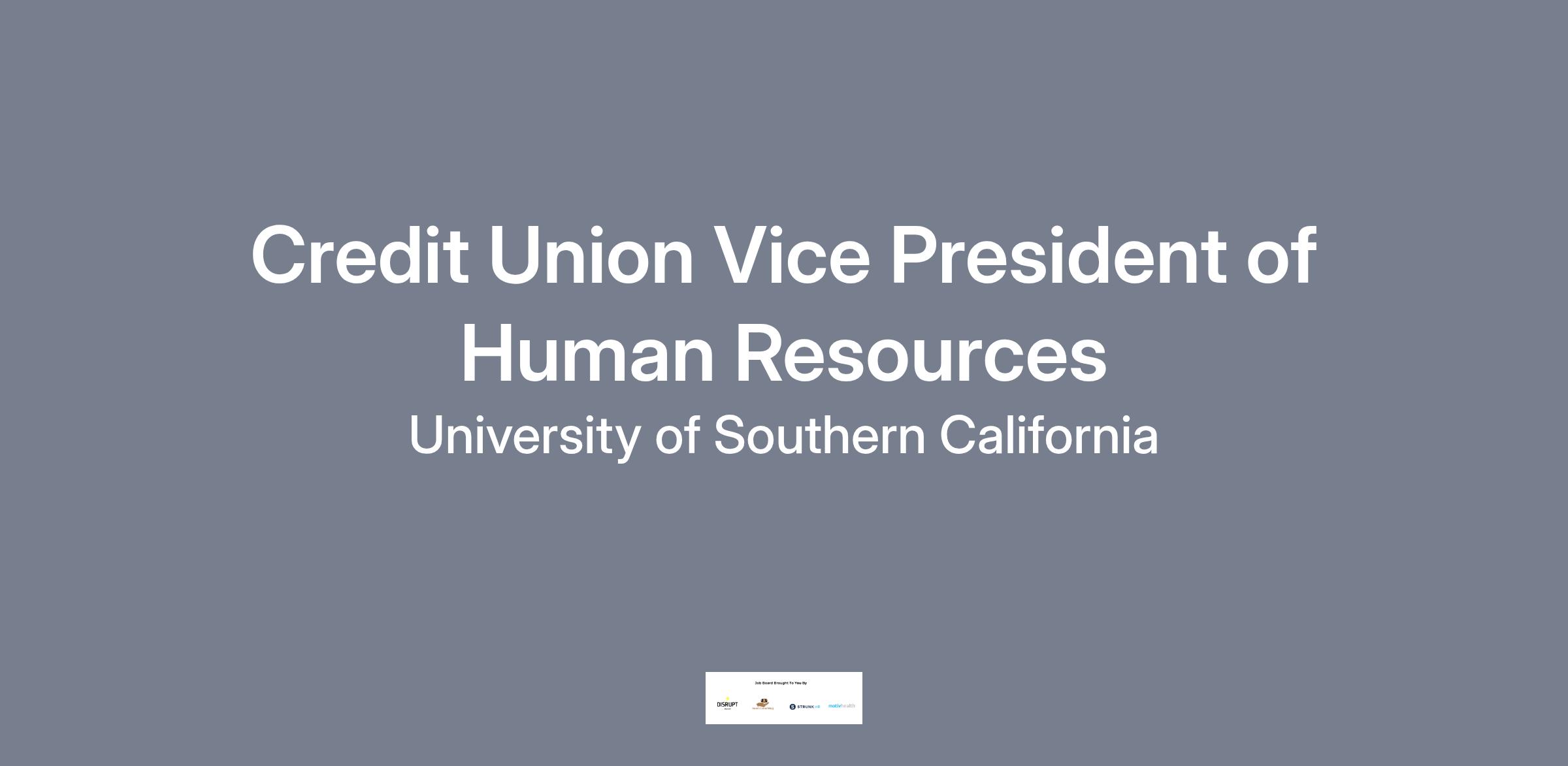 USC Credit Union is seeking an experienced, people-centered Vice President of Human Resources to join our team. This part-time, onsite role will work three days per week and reports directly to the CEO. The VP of HR will oversee a broad and complex HR function supporting staff, student workers, and managers across multiple departments. This executive leader will be responsible for delivering high-quality HR services, including recruitment, employee and labor relations, total rewards management, training and development, workforce planning, workers’ compensation, disability coordination, and HRIS management. The VP will design and enhance internal HR programs, collaborate closely with USC’s central HR partners, and cultivate a workplace culture that reflects USC Credit Union’s values and aligns with the USC Code of Ethics.
