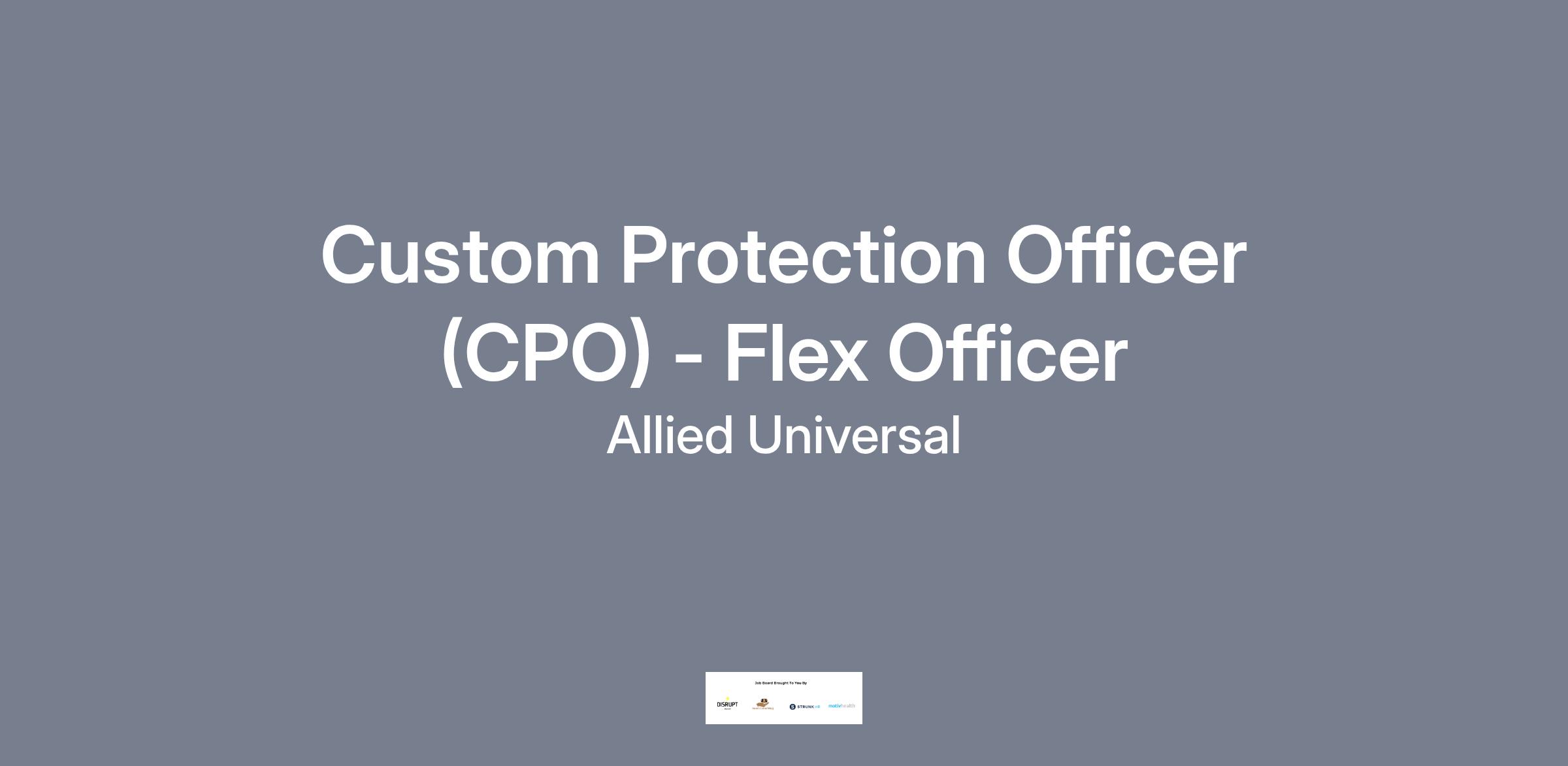 Allied Universal® is hiring a Custom Protection Officer (CPO) Flex Officer. The Custom Protection Officer Flex Officer will conduct armed and/or unarmed foot and/or vehicle patrol (interior and/or exterior). Additional duties include control access and egress; monitor CCTV and alarm systems; compose reports; deter criminal activity and misconduct. The Custom Protection Flex Officer will work at various assignments and may be called upon to work irregular shifts at times with little to no advance notice.