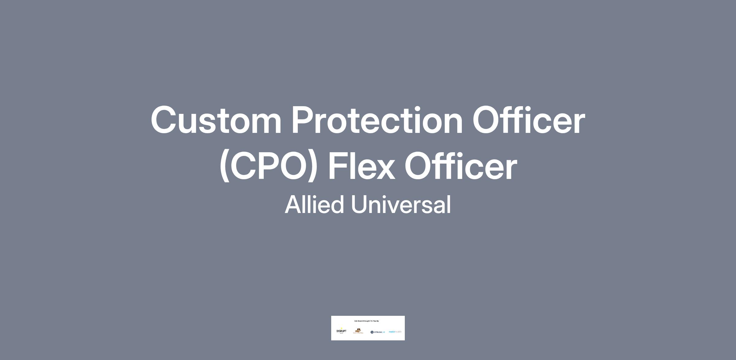 Allied Universal® is hiring a Custom Protection Officer (CPO) Flex Officer. The Custom Protection Officer Flex Officer will conduct armed and/or unarmed foot and/or vehicle patrol (interior and/or exterior). Additional duties include control access and egress; monitor CCTV and alarm systems; compose reports; deter criminal activity and misconduct. The Custom Protection Flex Officer will work at various assignments and may be called upon to work irregular shifts at times with little to no advance notice.
