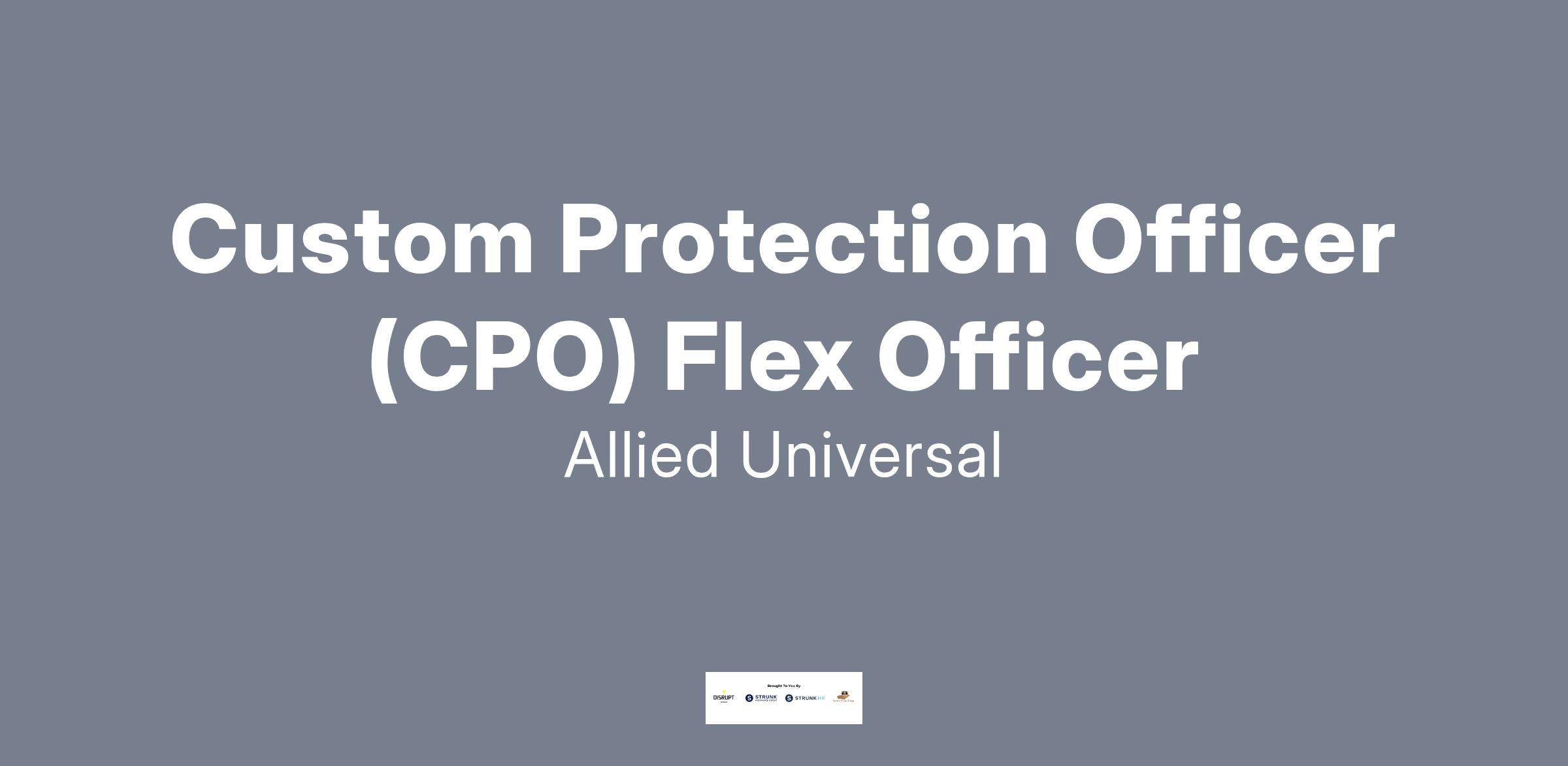 Allied Universal® is hiring a Custom Protection Officer (CPO) Flex Officer. The Custom Protection Officer Flex Officer will conduct armed and/or unarmed foot and/or vehicle patrol (interior and/or exterior). Additional duties include control access and egress; monitor CCTV and alarm systems; compose reports; deter criminal activity and misconduct. The Custom Protection Flex Officer will work at various assignments and may be called upon to work irregular shifts at times with little to no advance notice.