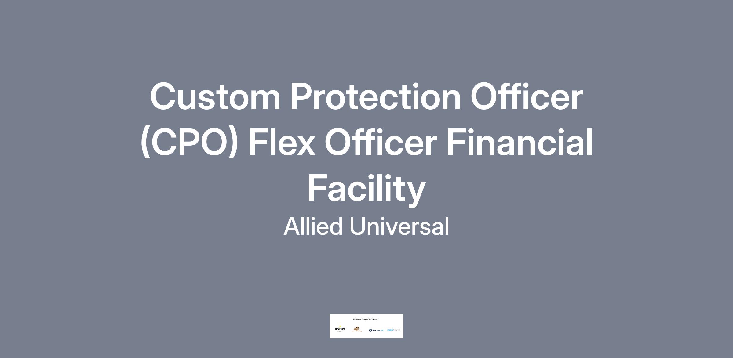 Allied Universal® is hiring a Custom Protection Officer (CPO) Flex Officer. The Custom Protection Officer Flex Officer will conduct armed and/or unarmed foot and/or vehicle patrol (interior and/or exterior). Additional duties include control access and egress; monitor CCTV and alarm systems; compose reports; deter criminal activity and misconduct. The Custom Protection Flex Officer will work at various assignments and may be called upon to work irregular shifts at times with little to no advance notice.