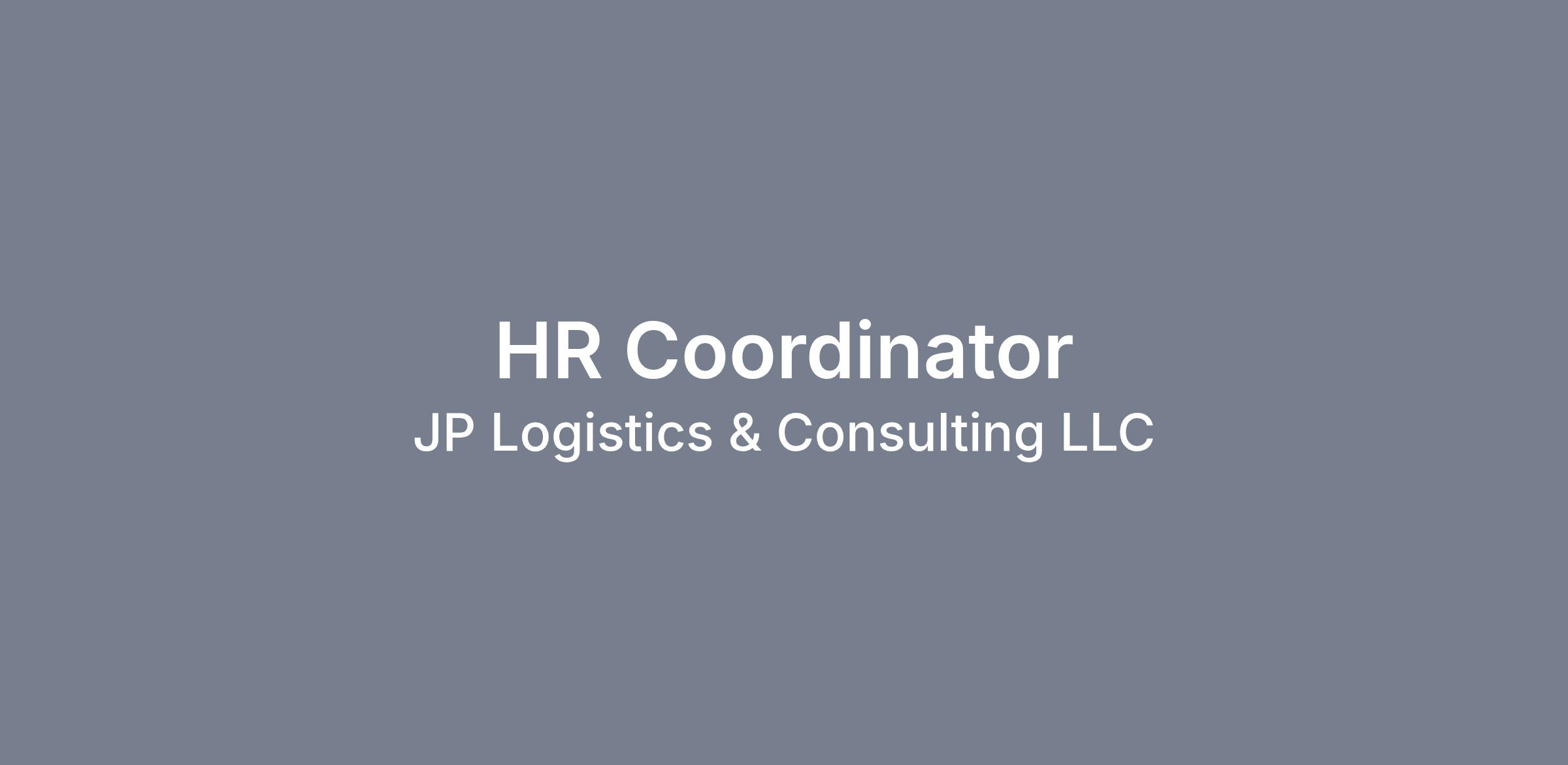 JP Logistics & Consulting LLC (JPLC) is looking for a full time Human Resources (HR) Coordinator to support a unique and growing company in a fast-paced environment.