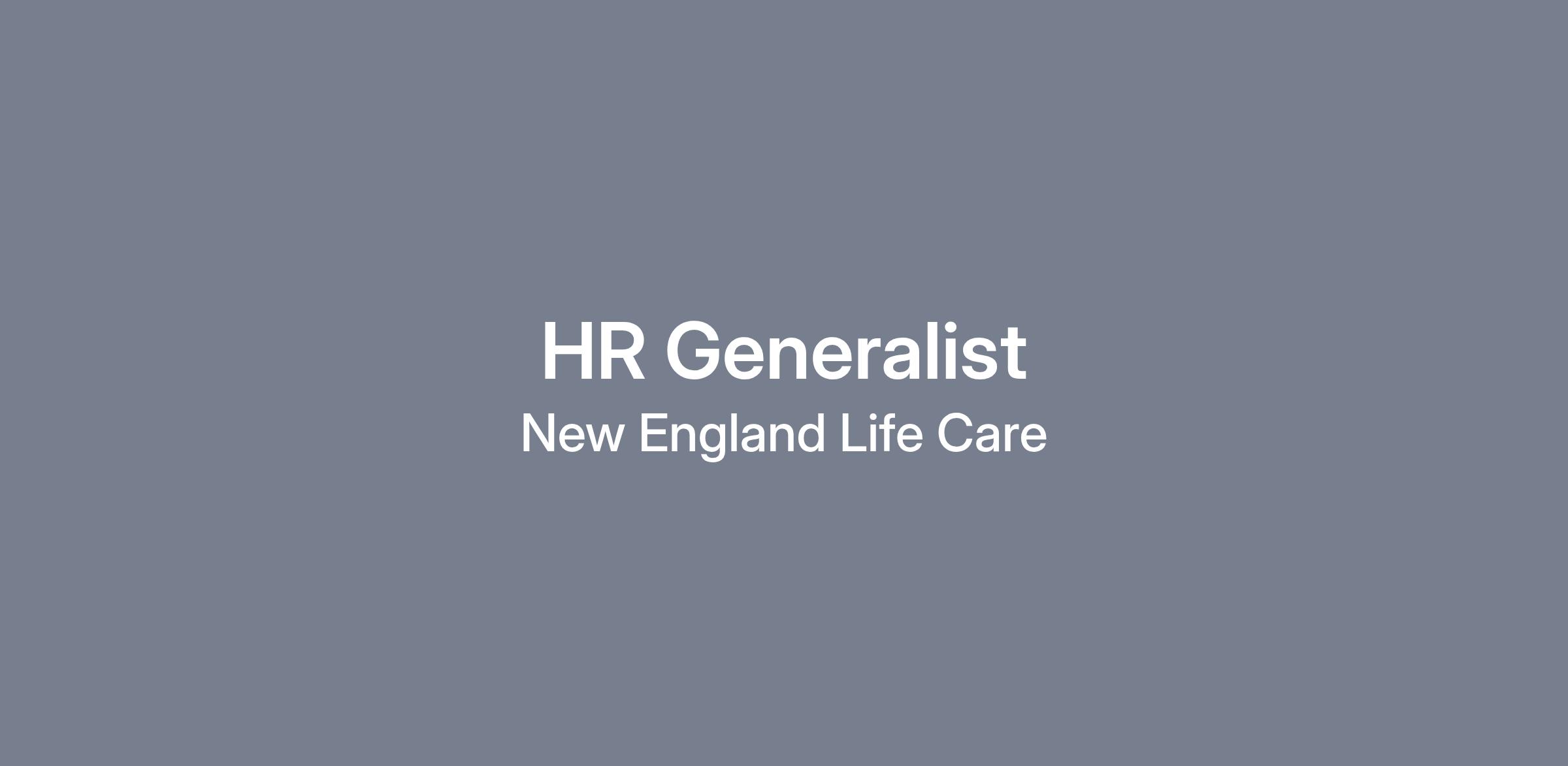 New England Life Care is hiring an HR Generalist to join our growing team! This are full–time, salaried, exempt position with a normal Monday – Friday schedule between the hours of 8:30am until 5:00pm.