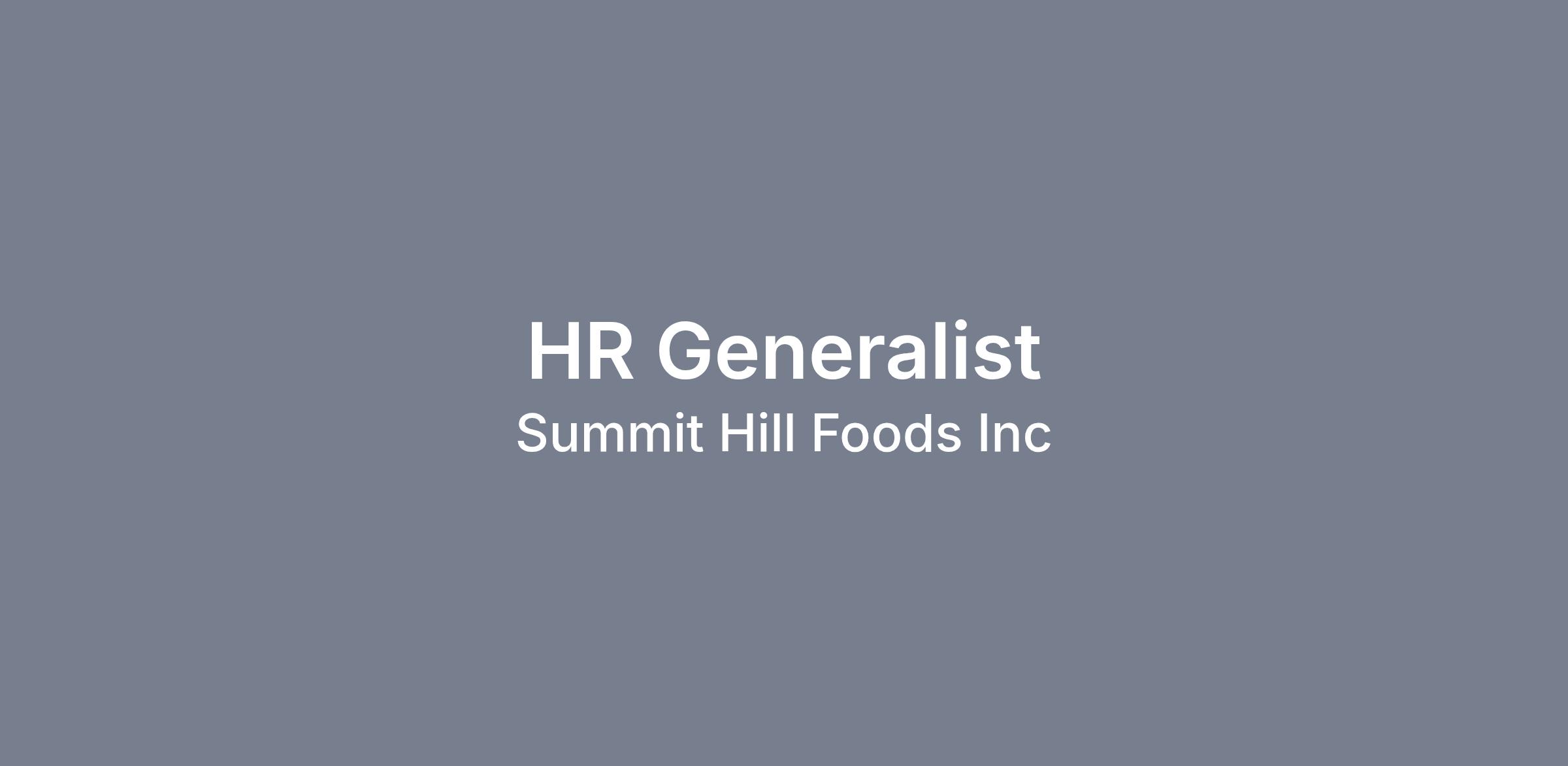 The Human Resources Generalist will consistently and proactively work to maximize the value of Summit Hill Foods through continuous improvement, driving EVA growth, and being a champion of the HPWP culture. The HR Generalist performs Human Resources related duties at the professional level and may carry out responsibilities in some or all of the following functional areas: Employee relations, recruiting, training and development, benefits, compensation, organizational development, employment practices, and Human Resource Information Systems (HRIS). This position proactively supports all company needs.
