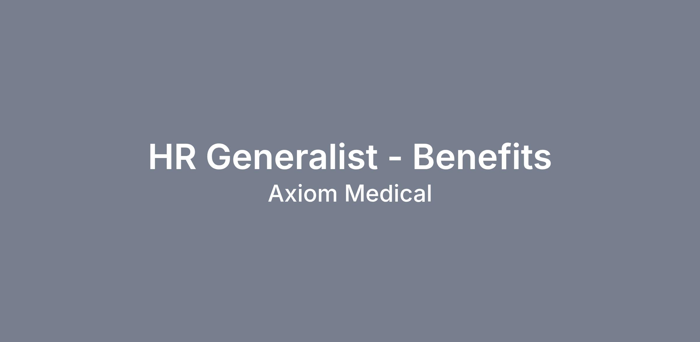 Axiom Medical Consulting is seeking an Human Resource Generalist to join our team. The Human Resource Generalist is responsible for various functions of the Human Resource department, with a heavy emphasis on onboarding, benefits, leave of absence, reporting, and administration of company policies.