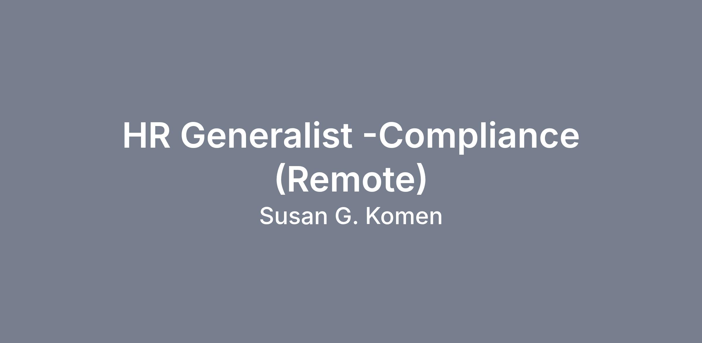 The Human Resources Generalist is responsible for managing a wide range of HR functions within Susan G. Komen. The role supports multiple aspects of employee experience including compliance, HRIS maintenance and employee relations. The HR Generalist will help to align Komen HR practices with organizational goals while ensuring legal compliance and promoting a positive workplace culture.