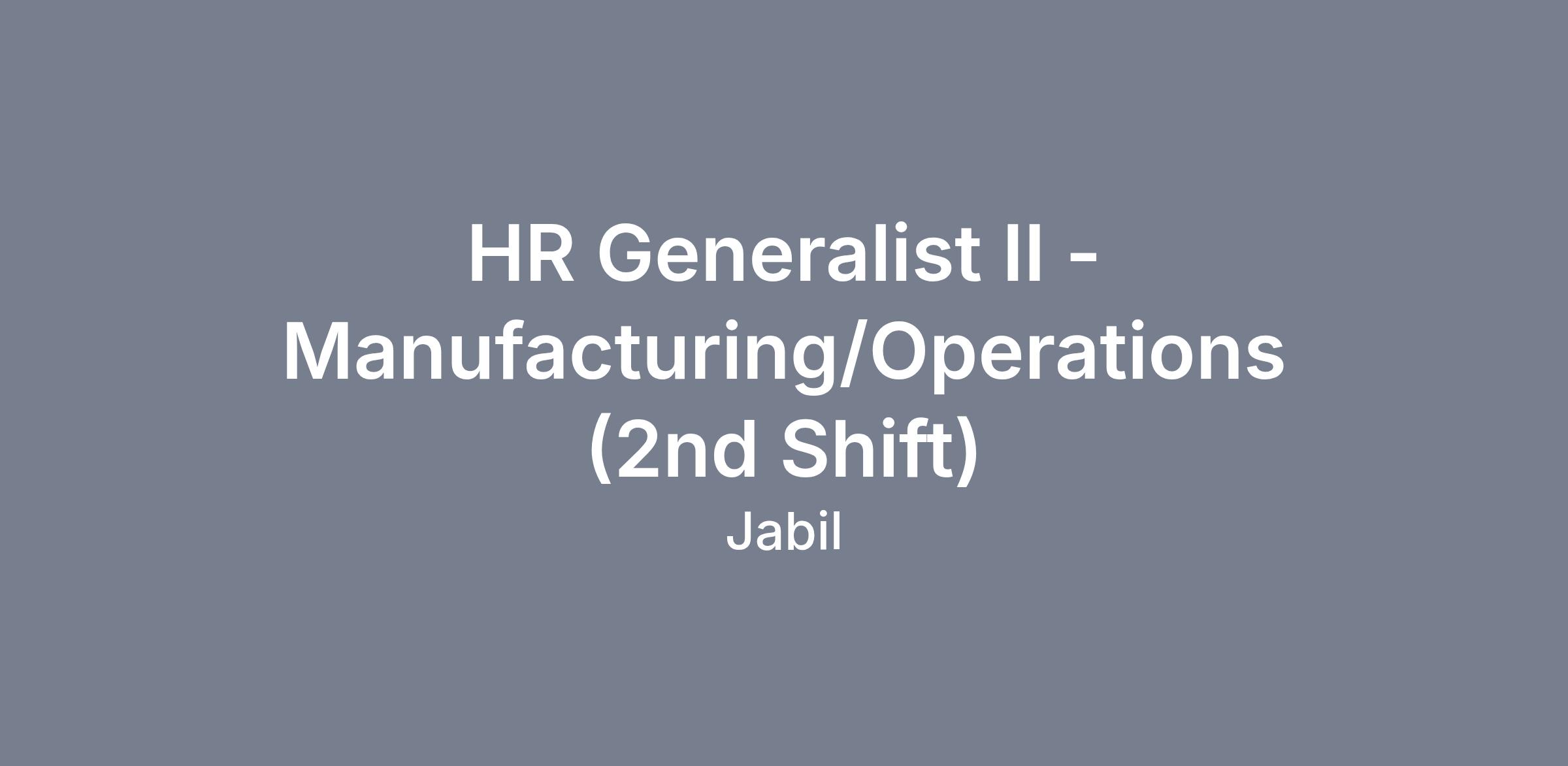 The HR Generalist, Operations serves as the primary on-site HR presence for second-shift operations, providing hands-on support to supervisors and employees in a growing, fast-paced manufacturing environment. This role focuses heavily on employee relations, policy interpretation, attendance and performance management, training administration, and compliance, with responsibility for independently addressing routine and moderately complex HR issues during second shift operations. The HR Generalist II partners closely with Operations leadership to drive accountability, consistency, and engagement across the workforce.