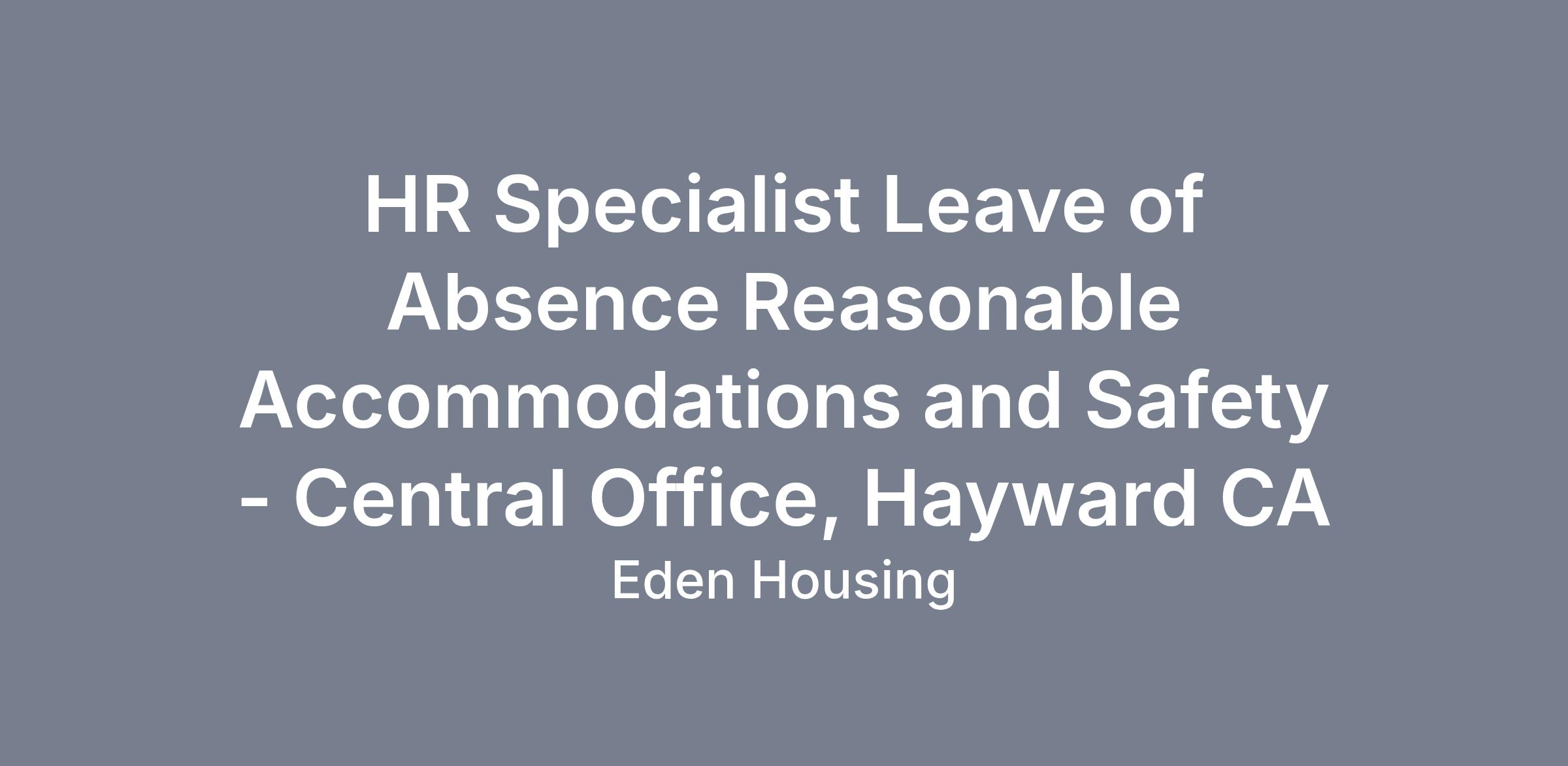 The Human Resources Specialist provides broad professional HR services to all Eden Housing managers and employees in the areas including (and not limited to) employment and policy administration/compliance, workers compensation, leave management, reasonable accommodations and safety programs.