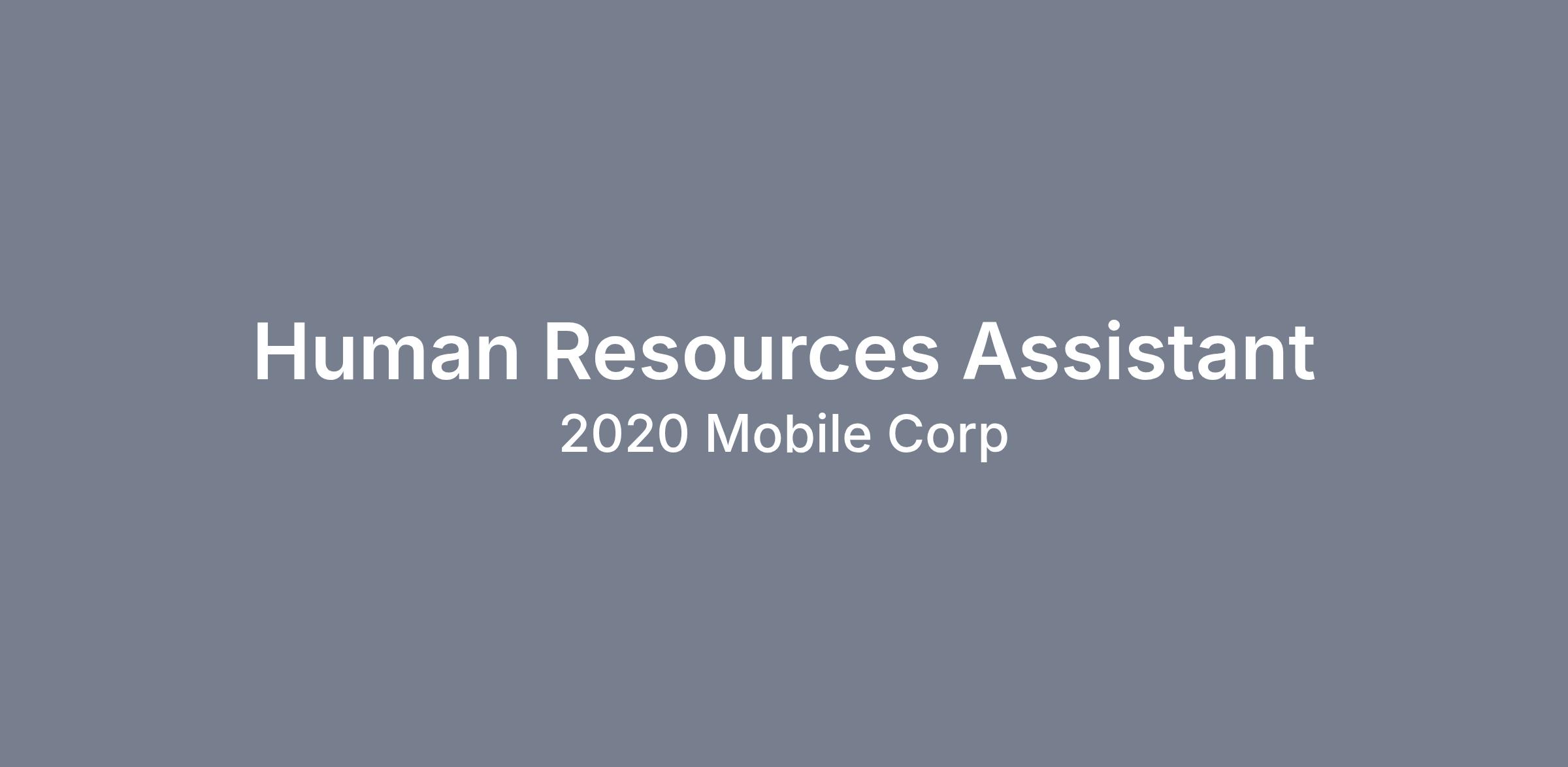 2020 Mobile Corp is looking for a detail-oriented and proactive part-time HR Assistant to join our team! If you're organized, a great communicator, and eager to support a growing team, we’d love to hear from you.