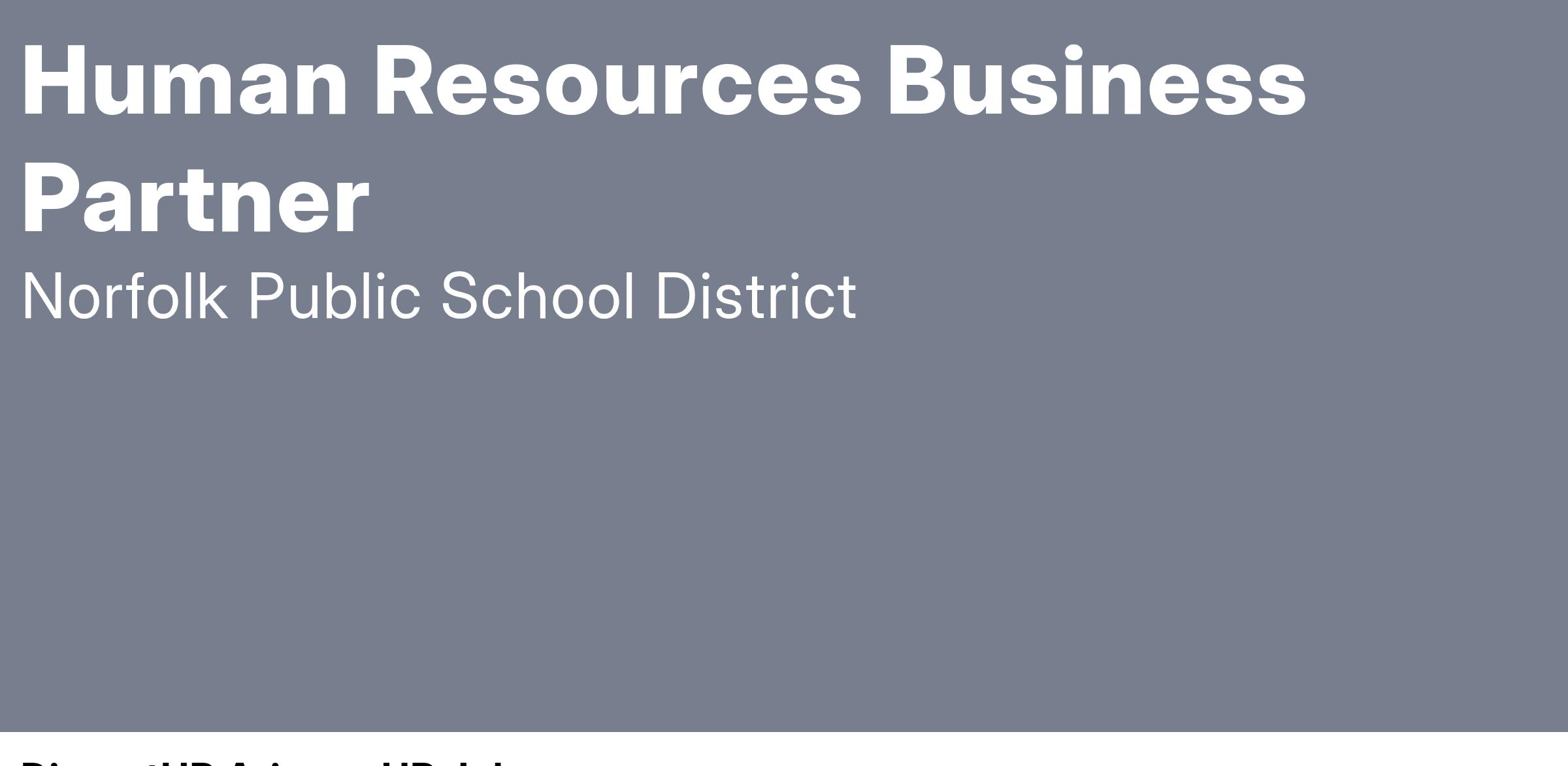 The Human Resources Business Partner plans, manages, and performs the full range of professional duties required to support division-wide and departmental personnel and organizational change projects for assigned management groups; carries out duties or practices with a commitment to fair and impartial practices that promote an inclusive working environment in support of equity initiatives; serves as a business advocate to deliver integrated solutions in alignment with resources that link workforce strategies with needs and goals; mitigates risk; provides guidance on Norfolk Public Schools policies and procedures; recommends process development to support operational excellence; coaches and mentors staff; serves as a strategy-focused leader to blend HR expertise with business operations.