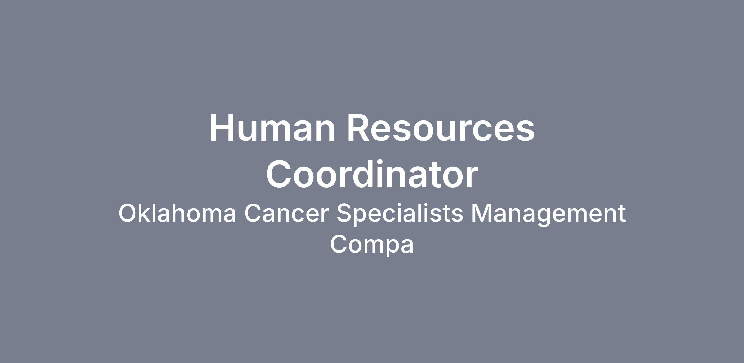 This position will recruit, screen, interview, or place individuals within the organization. Will assist with compensation, benefits, and job analysis for employer. May specialize in specific areas, such as position classification and programs. Assist with policy updates and compiling data and summary reports. Provides continuous support for the day-to-day operations of the Human Resources Department. Supports and adheres to the Oklahoma Cancer Specialists and Research Institute Compliance Program, to include the Code of Ethics and Business Standards. Qualifications: Associate degree in Human Resources Management required. Bachelor’s degree in Human Resources or related field preferred. Excellent computer skills, including Word and Excel in a Microsoft Windows environment; effective oral and written communication skills; intermediate knowledge of various employment laws and practices; excellent interpersonal and organizational skills; and able to exhibit high level of confidentiality. Technical writing experience highly desirable. Data analysis experience preferred. Minimum three years of office administration and five years of Human Resources experience required. Prior healthcare experience a plus.