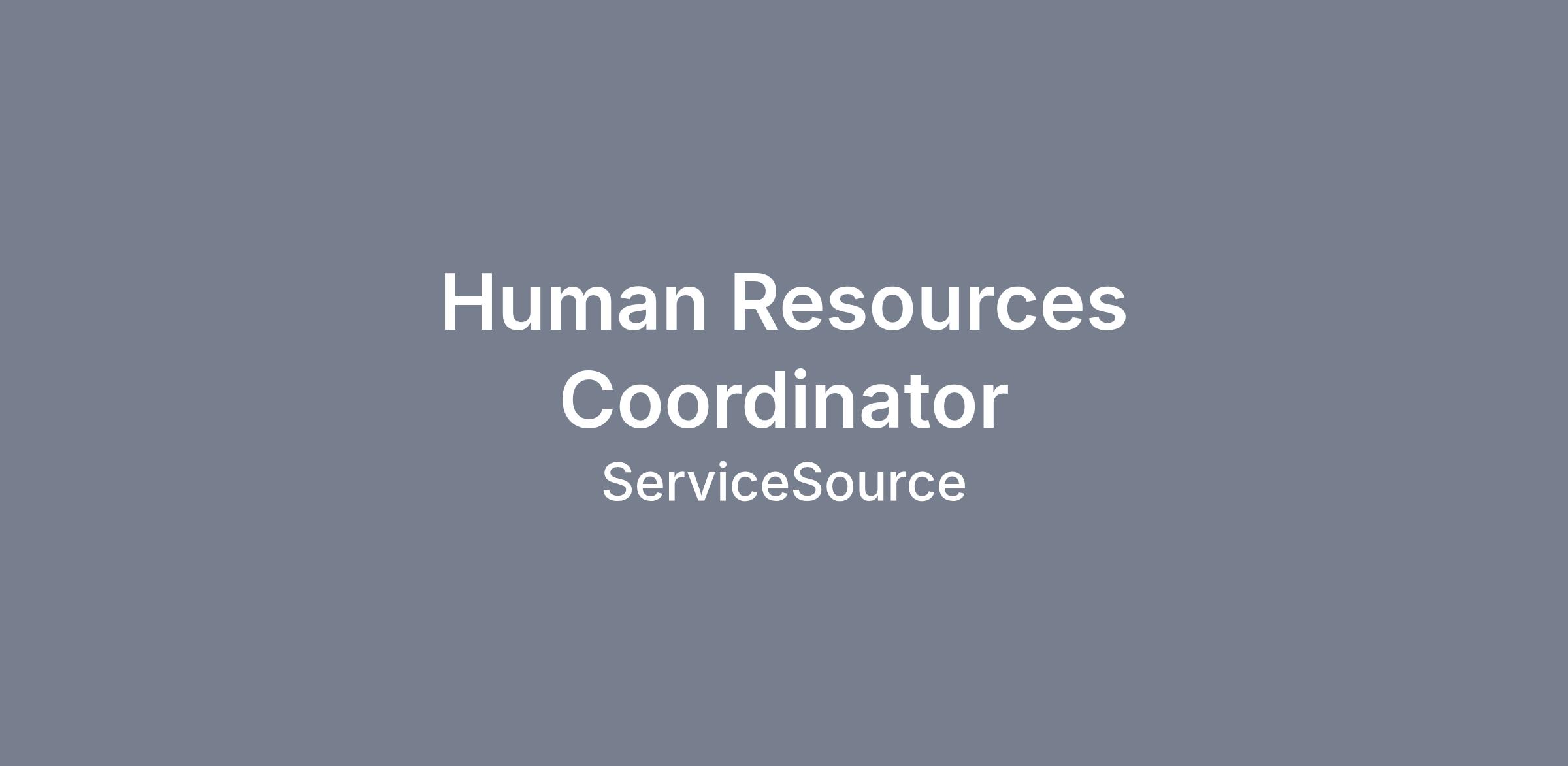 The Human Resource Coordinator assists with and coordinates human resource processes. This role administers ServiceSource’s policies, programs, and practices. This position includes a focus on recruiting, new hire onboarding, data entry into the HRIS, creating and maintaining personnel files, and administration of employee data changes. The Human Resource Coordinator provides support to the HR functions as needed including record-keeping, file maintenance, and HRIS entries, as well as adherence to federal and state regulations.