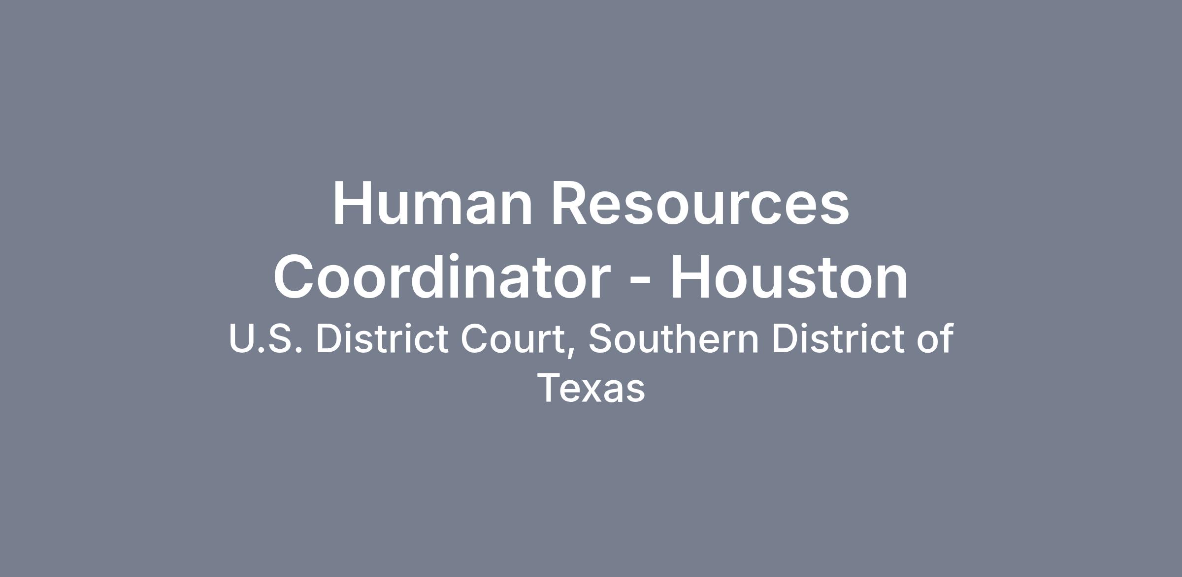 The Human Resources Coordinator will work within the Human Resources Department located in Houston, Texas. Human Resources supports the judicial officers and their staffs, as well as the employees of the District/Bankruptcy Clerk's Office and Probation. As part of the consolidated shared administrative services team, the incumbent will assist with providing a full range of Human Resources support to the court units including (not limited to):