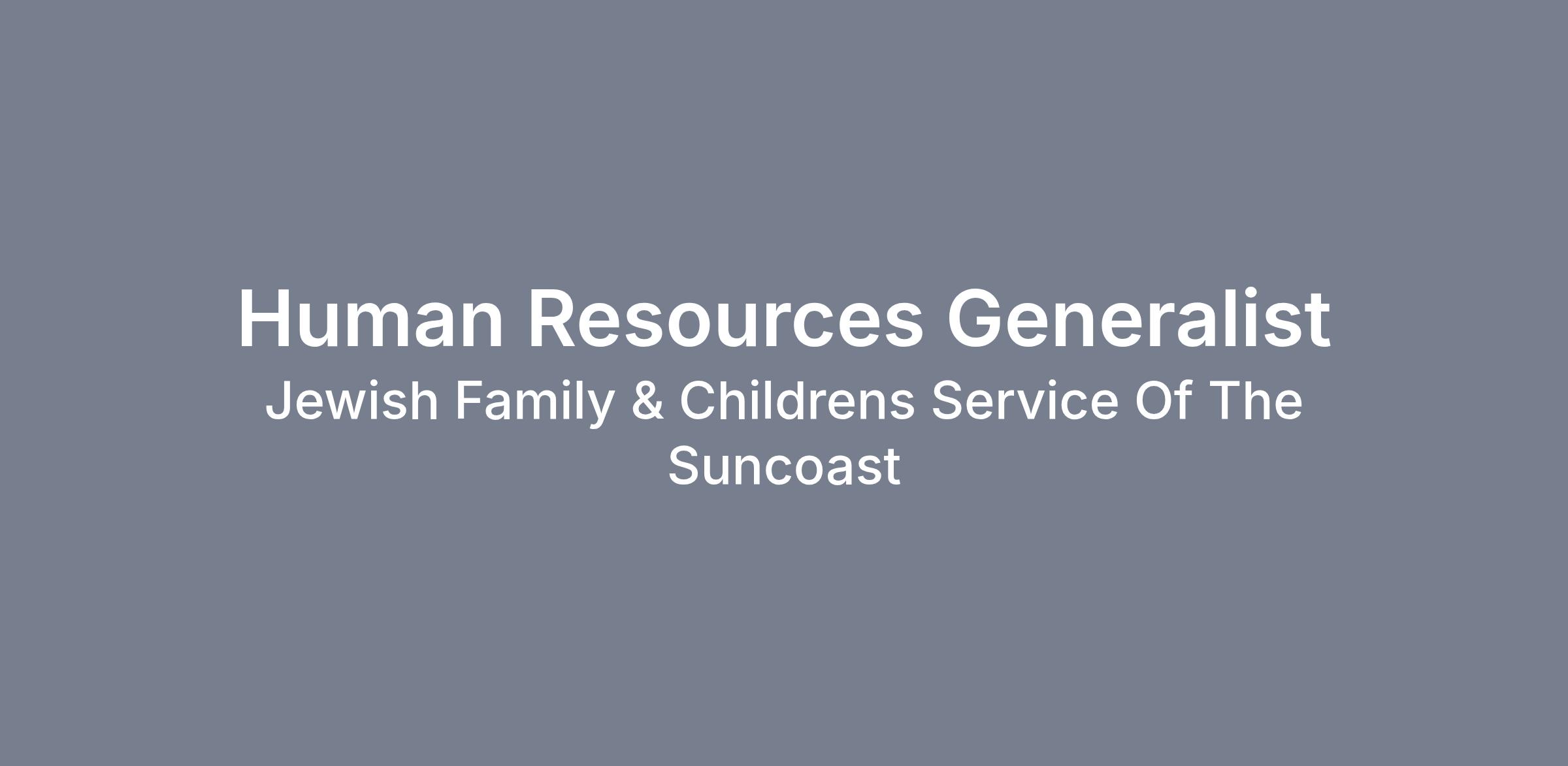 POSITION DESCRIPTION Position Title: Human Resources Generalist Program: Human Resources Reports to: Vice President of Operations Classification: Part-Time, Non-Exempt Job Summary: The mission of the Human Resource Generalist is to support the goals and challenges of the Jewish Family & Children Services (JFCS) by providing services that promote a work environment that is characterized by fair treatment to all employees, open communication, personal accountability, trust and mutual respect. We seek to provide solutions to workplace issues that support and optimize the operation principles of the Agency. The Human Resources Generalist contributes to the accomplishment of Human Resource practices and objectives through efficient/compliant and heart-felt service to the employees and future employees of Jewish Family & Children's Services.