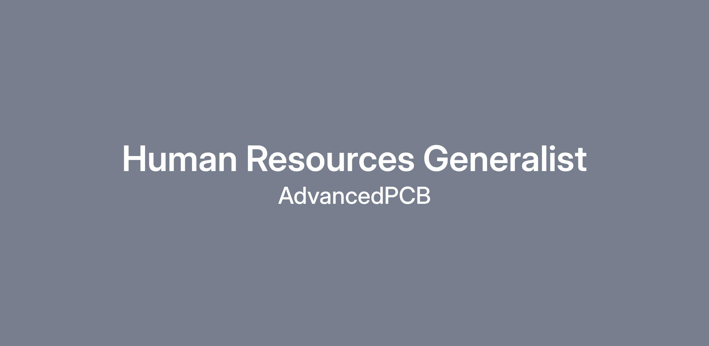 The Human Resource Generalist aids with and facilitates the human resource processes at their assigned business location(s). The Human Resource Generalist will assist in ensuring the AdvancedPCB philosophy is consistently reinforced by holding all staff accountable through positive reinforcement of policies and procedures.