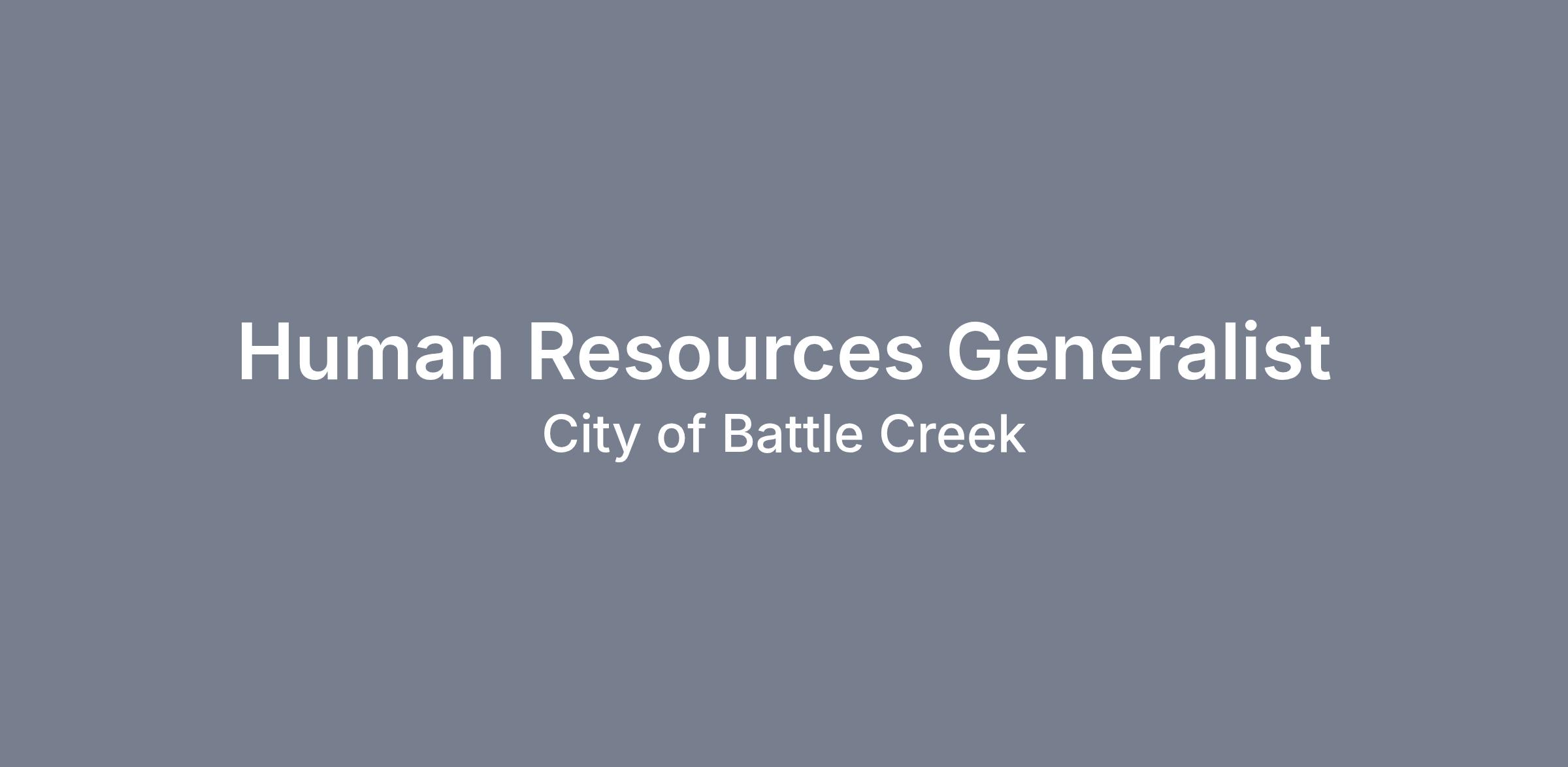The City of Battle Creek is looking for a Human Resources Generalist to complete a variety of tasks to support the day to day operations of the HR department. Effectively handles multiple processes and programs relating to a broad range of HR responsibilities including recruitment, onboarding, payroll processing, benefits and employee development, and related work as apparent or assigned. Work is performed under the limited supervision of the Human Resources Director.
