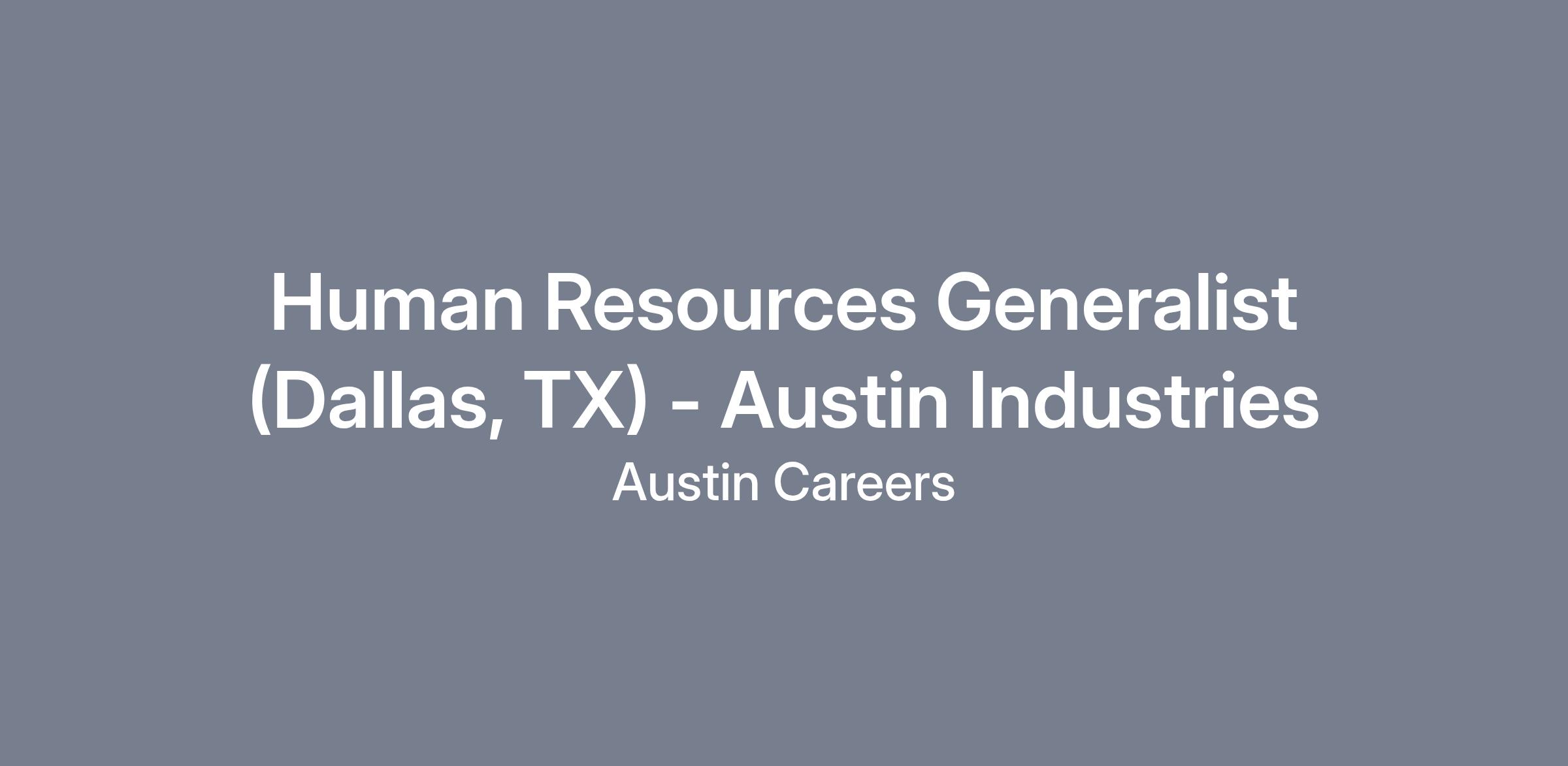Austin Industries has an outstanding opportunity for a Human Resources Generalist at our Corporate Office in Dallas, Texas. Our Our HR Generalist will provide a wide range of human resources support to the department and company. This position will be responsible for maintaining and building knowledge and skills in all HR disciplines from employee orientation and recruitment, compensation and benefits, EEO, legal requirements for employers, and training and development.