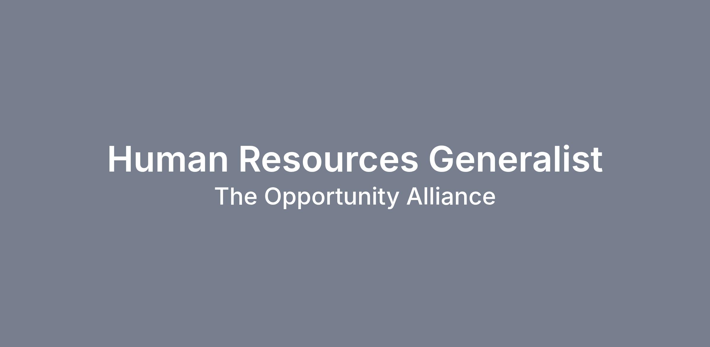 The Opportunity Alliance is seeking a friendly, energetic, driven, and detail-oriented Generalist to join our Human Resources Department. This is an opportunity to join a dynamic team and learn the functionalities of Human Resources and other intricacies within our agency.