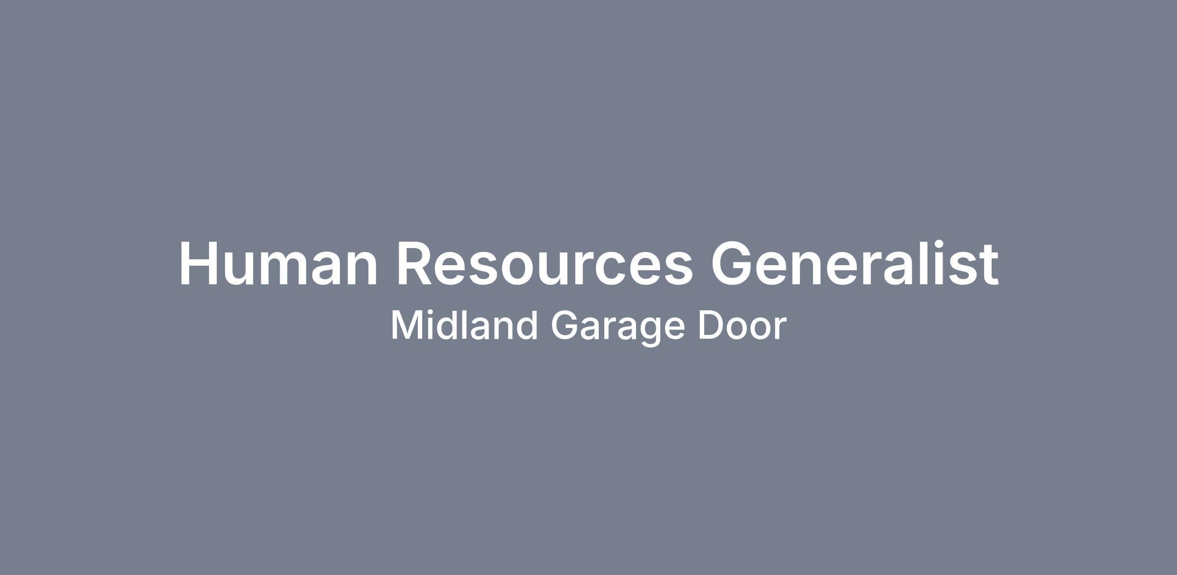 Human Resources GeneralistMonday-Friday 8:00am-5:00pmCompetitive Salary*This position is not eligible for remote work*Are you passionate about building a strong workplace culture and supporting employees at every stage of their journey? For over 45 years, Midland Garage Door has been a trusted leader in the garage door industry, thanks to our dedicated team, excellent customer service, and commitment to quality. We’re looking for an experienced Human Resources Generalist to play a key role in fostering employee engagement, supporting day-to-day HR operations, and helping our team thrive in a positive, growth-minded environment.Summary: The Human Resources Generalist plays a key role in supporting the day-to-day operations of the HR department and serves as a point of contact for employees across the organization. This position is responsible for handling a broad range of HR responsibilities, including onboarding and employee relations. This position will also serve as backup to the Payroll and Benefits Specialist, Recruiter, and offsite Human Resources Generalist. The ideal candidate is organized, approachable, detail-oriented, and committed to delivering exceptional HR service in a confidential and professional manner.Essential Duties:- Serve as an approachable resource to all employees—promoting an open-door policy via in-person, phone, and email communication.