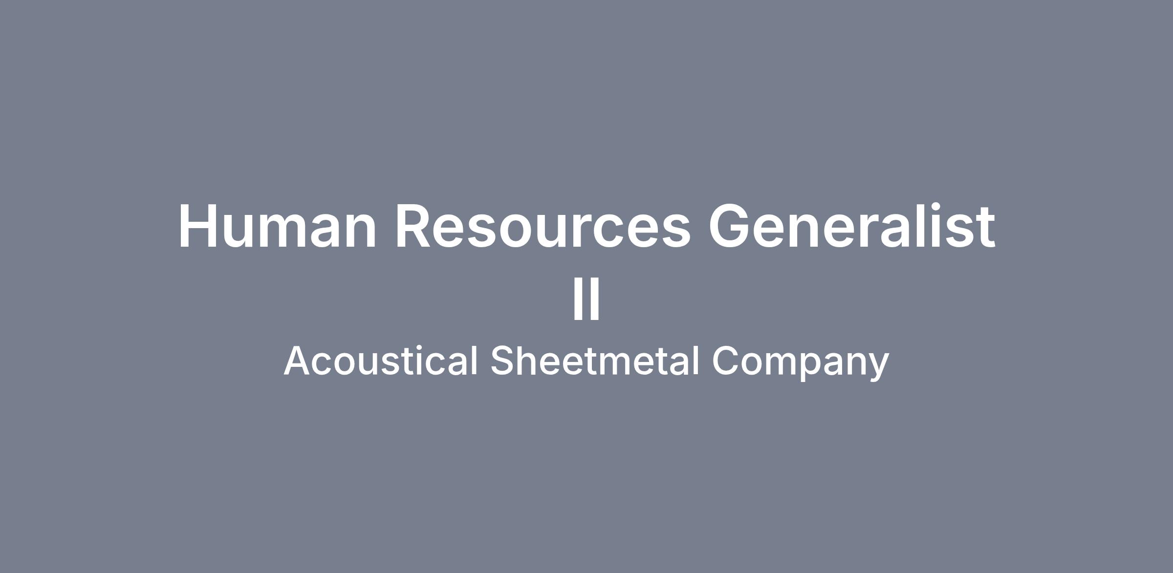 Acoustical Sheetmetal is seeking a dynamic and HR Generalist II to play a vital role in supporting the day-to-day operations of our Human Resources department. This position is key to ensuring a positive and productive workplace, where employees feel supported and policies are consistently upheld. We’re looking for someone who’s passionate about people and ready to contribute to a growing, hardworking team. The hours for this position are 8am –5pm, Monday through Friday. The candidate will provide HR support for our first shift employees. The role will require flexibility to support both of our manufacturing plants located in Virginia Beach as needed.