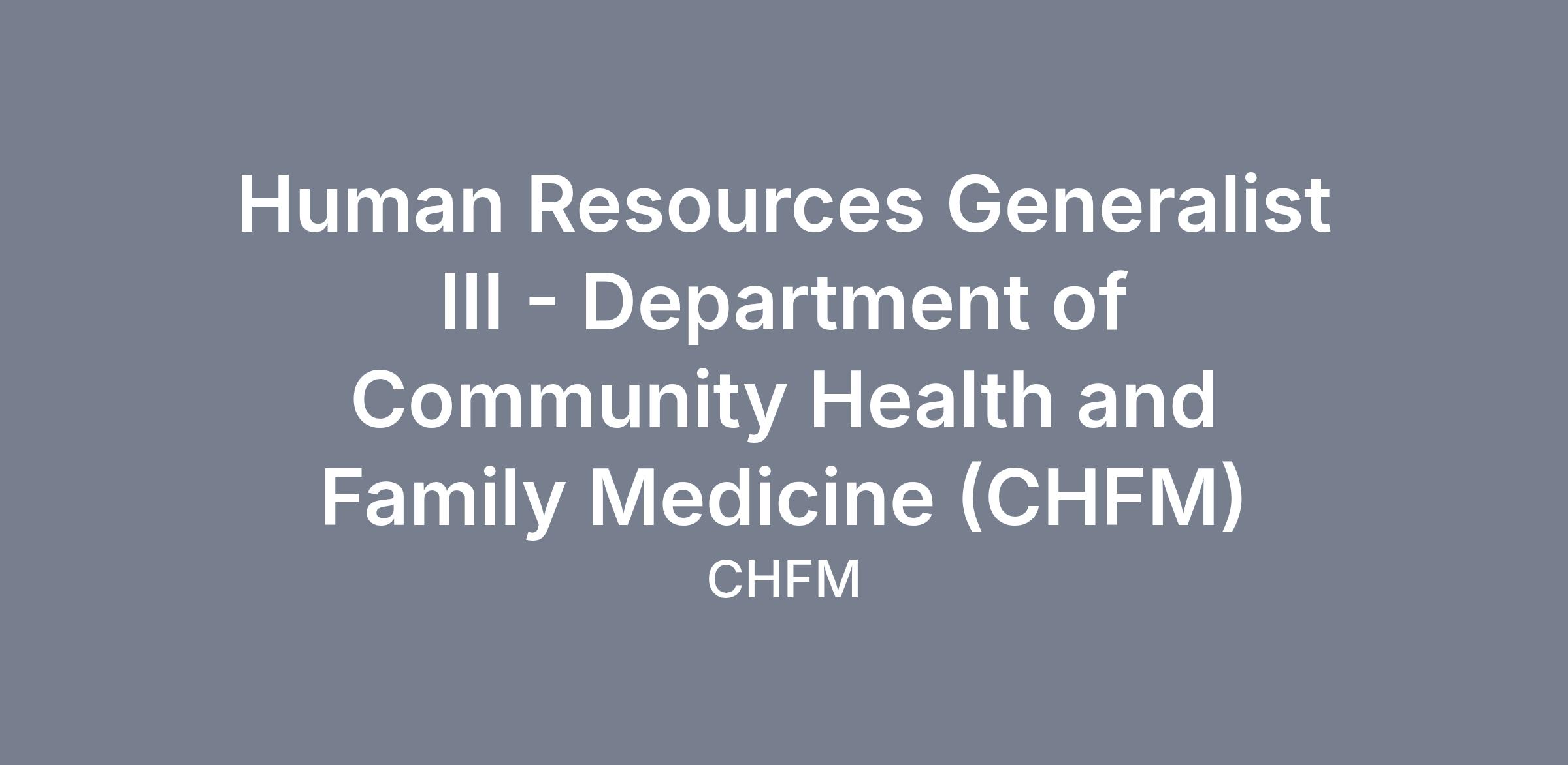 The HR Generalist III plays a critical role in managing the day-to-day human resources and payroll operations for the Department of Community Health and Family Medicine (CHFM), including its Regional Programs. This position provides comprehensive oversight of core HR functions including staffing and recruitment, onboarding and training, credentialing, and daily HR operations while ensuring compliance, consistency, and strong workforce support across a complex, multi-site clinical environment.