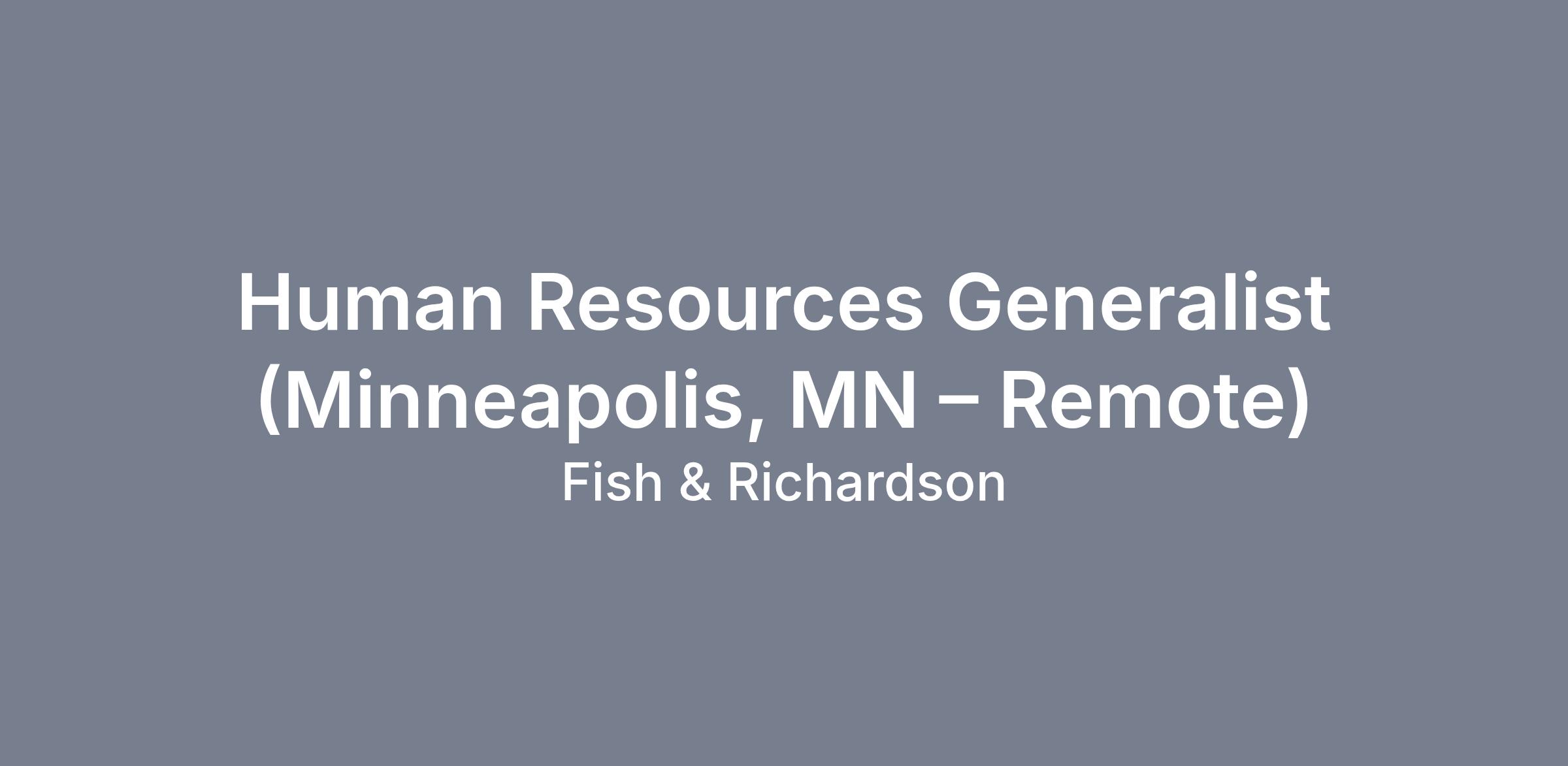 Fish & Richardson, the premier global intellectual property law firm, is trusted by the world’s most innovative and influential companies. Fish was established in 1878, and now has more than 400 attorneys and technology specialists in the U.S., Europe, and China. Our success is rooted in our creative and inclusive culture, which values the diversity of people, experiences, and perspectives. Join Fish’s Minneapolis team in our fast-paced Human Resources Department as a Human Resources Generalist (Minneapolis, MN – Remote).