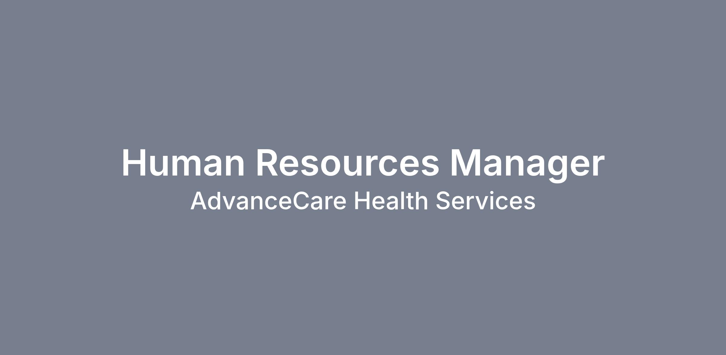 AdvanceCare Health Services, LLC is seeking a dedicated Human Resources Manager to ensure that all human resources (HR) operations are carried out smoothly and effectively. You should be able to manage programs and lead staff while also possessing a strong strategic mindset. The goal is to ensure that all HR needs of the company are being met and are aligned with all business objectives.
