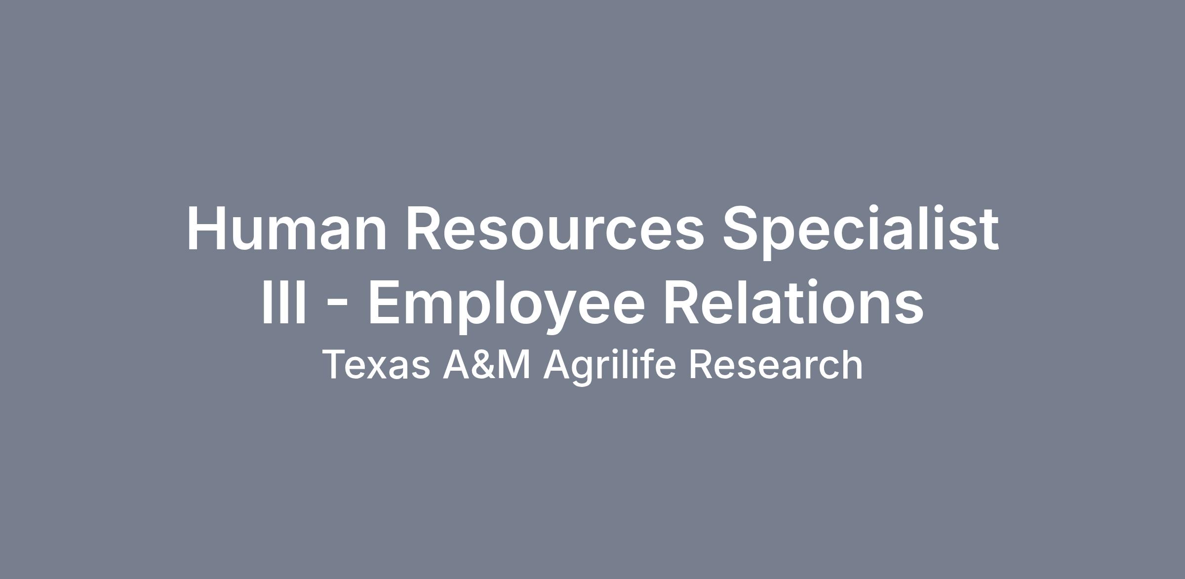 We are seeking a Human Resources Specialist III – Employee Relations, who under general supervision, performs specialized human resources duties related to Employee Relations and related activities in support of Texas A&M AgriLife entities. This role ensures compliance with labor laws, internal policies, and organizational values, and addresses workplace issues to enhance employee engagement, morale, and productivity.