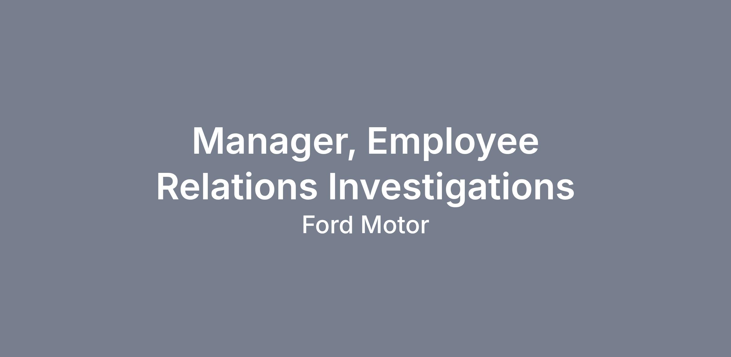 Our team is part of the incredible transformation underway at Ford Motor Company, and you’ll have a chance to be a part of that movement. We are seeking an investigations manager with a passion for employee relations and conducting robust investigations in a dynamic environment who appreciates the important role employee relations professionals play in supporting our values and culture and will carry out duties with the highest integrity.