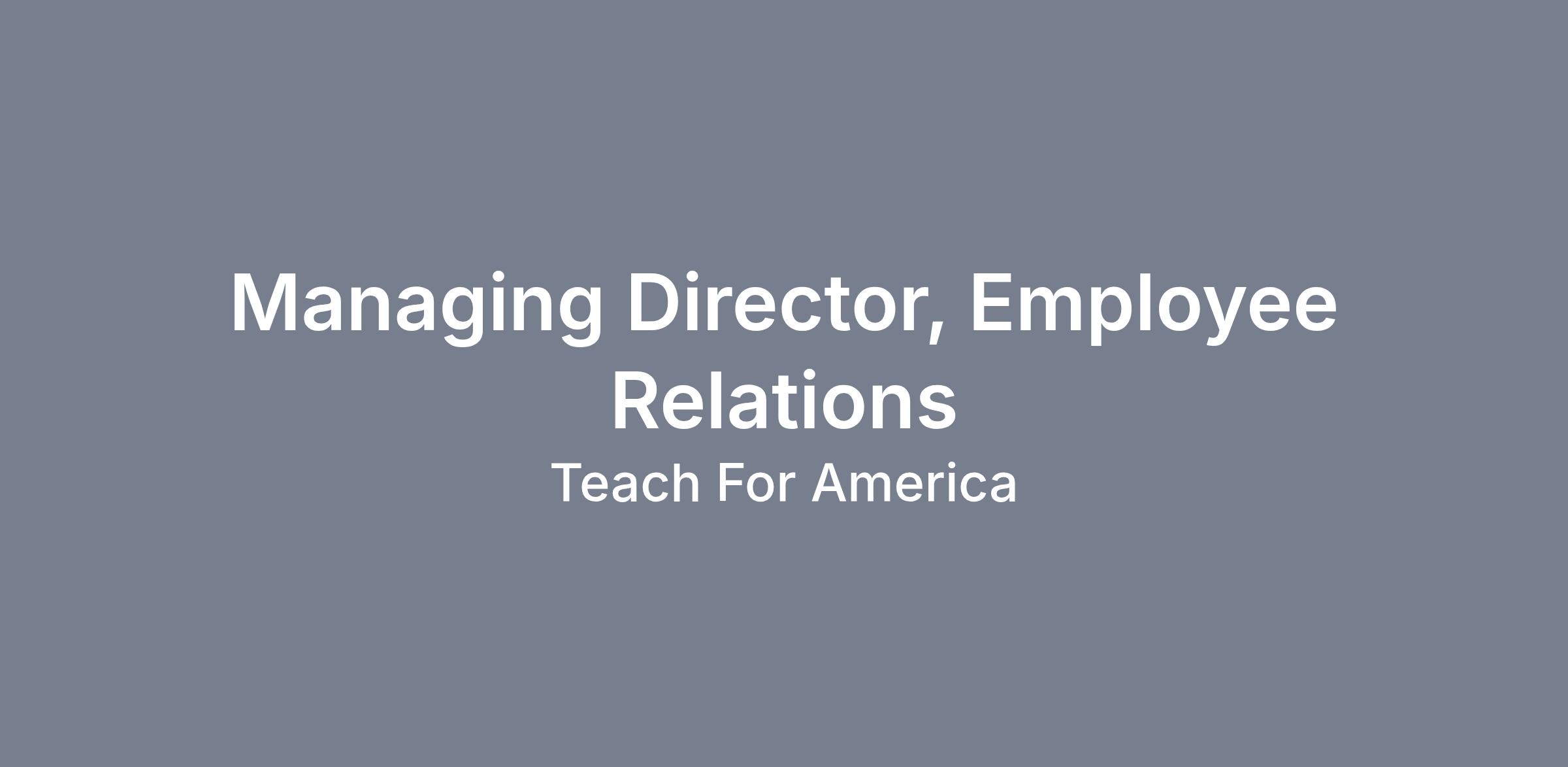 At Teach For America, we are inspired by a single mission – one day, all children will have access to an excellent education. In pursuit of that mission, we are looking for a Managing Director, Employee Relations to strengthen and support the staff experience. With the clear vision that Employee Relations goes beyond compliance – we have a commitment to ensuring a safe and inclusive workplace by strengthening our community, building trust and stewarding staff policies and practices.