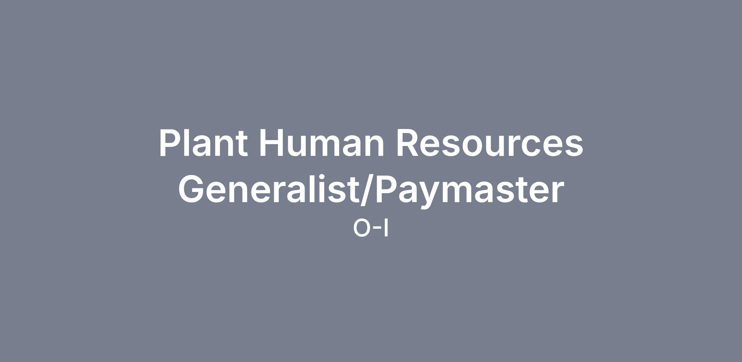 The Plant Human Resources Generalist/Paymaster will assist in the execution of staffing, payroll, performance management, employee development, training and succession planning. This hands-on position is responsible for driving the implementation of HR processes and initiatives.
