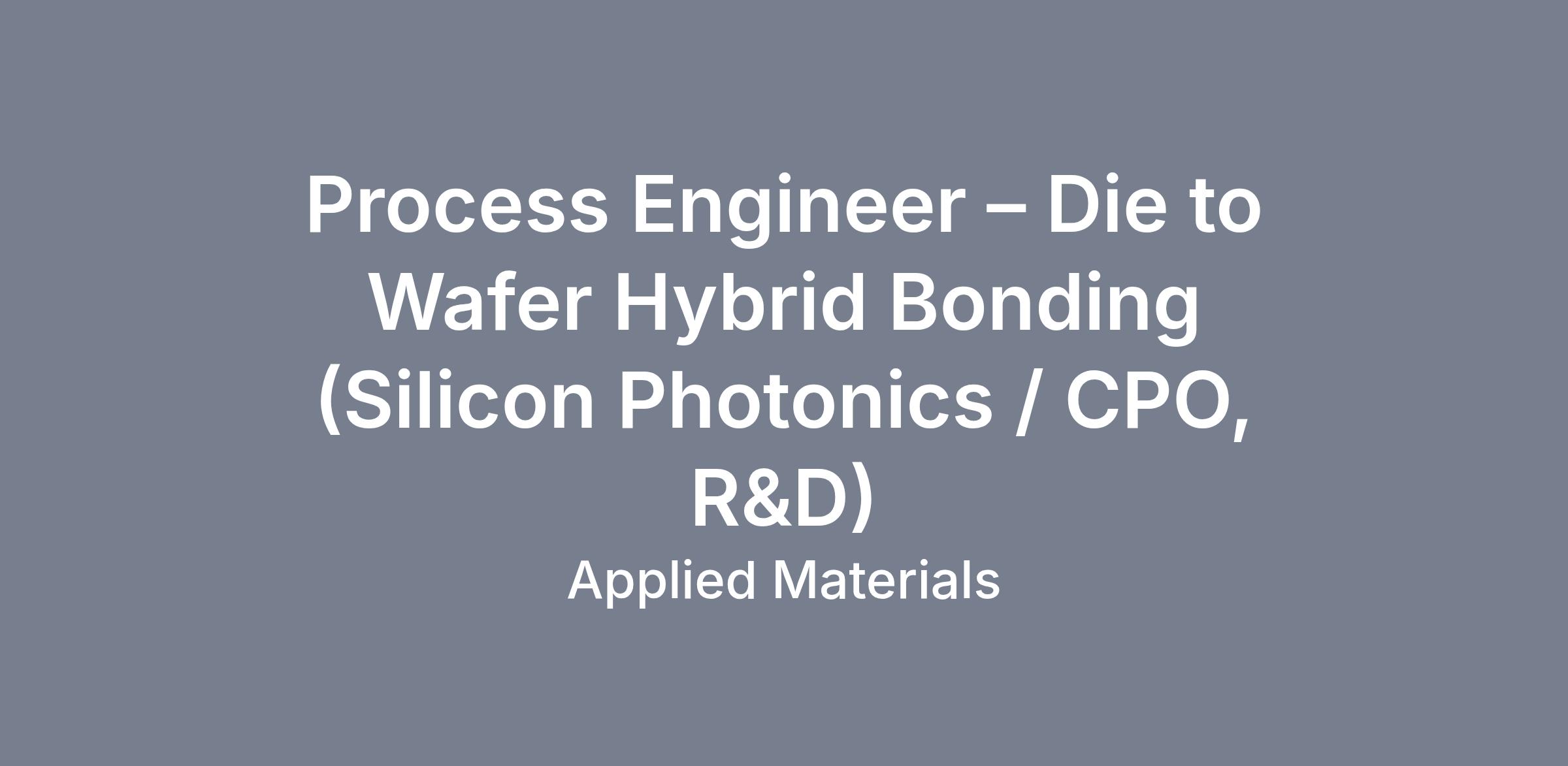 We are seeking a hands‑on Process Engineer to drive die‑to‑wafer (D2W) hybrid bonding R&D for silicon photonics and co‑packaged optics (CPO) applications. This role focuses on hybrid bonding process development, pathfinding, technology de‑risking, and integration exploration.