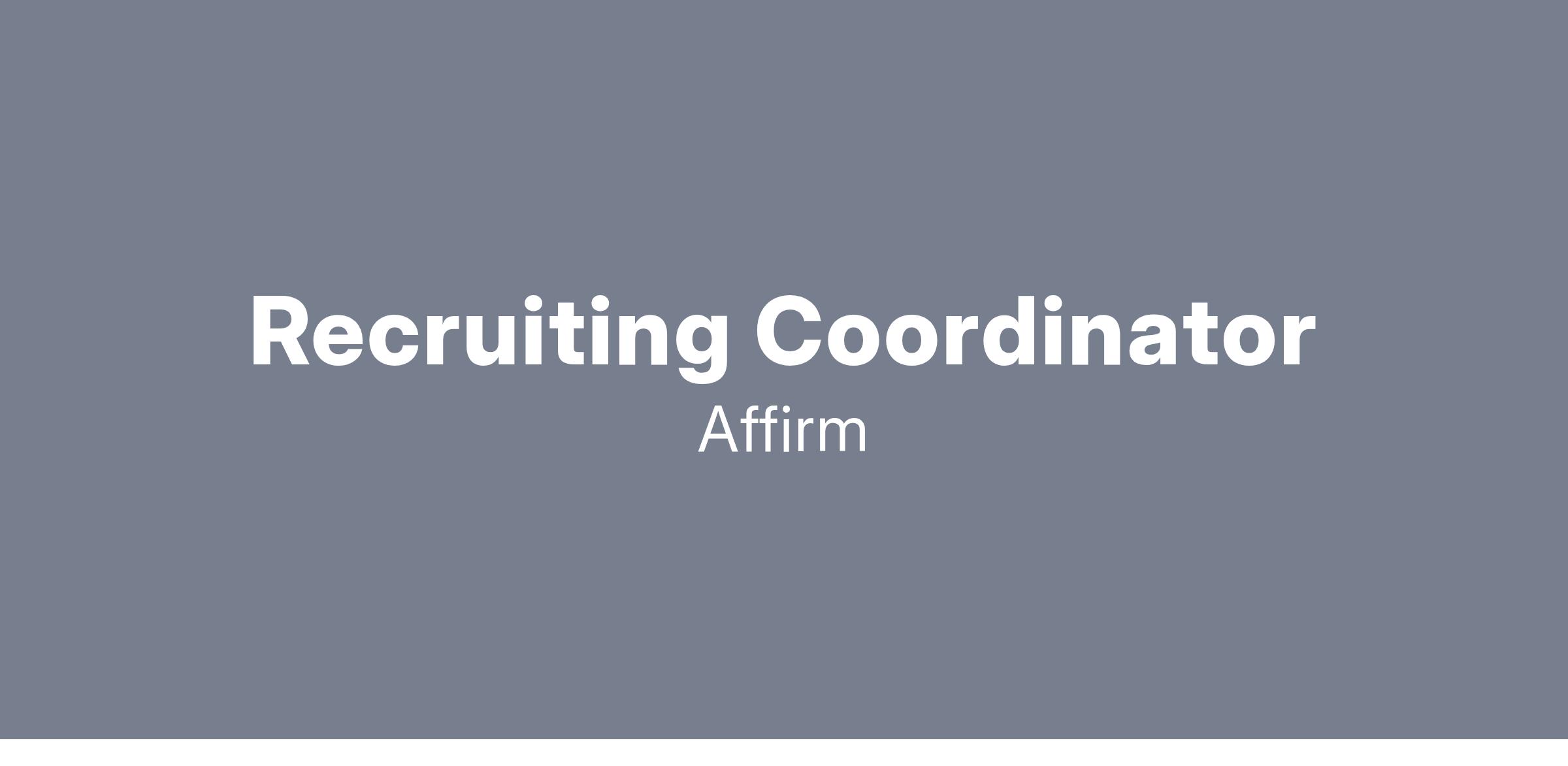 On the Talent Acquisition team, we work on the front lines of our company’s growth. This is a thrilling time for Affirm, and we will need more individuals to recruit the best talent. We’re seeking a sharp recruiting coordinator to tackle the hiring needs from various angles and allow our recruiting team to soar. No matter how awesome our mission sounds, we can’t achieve it without first hiring brilliant Affirmers.