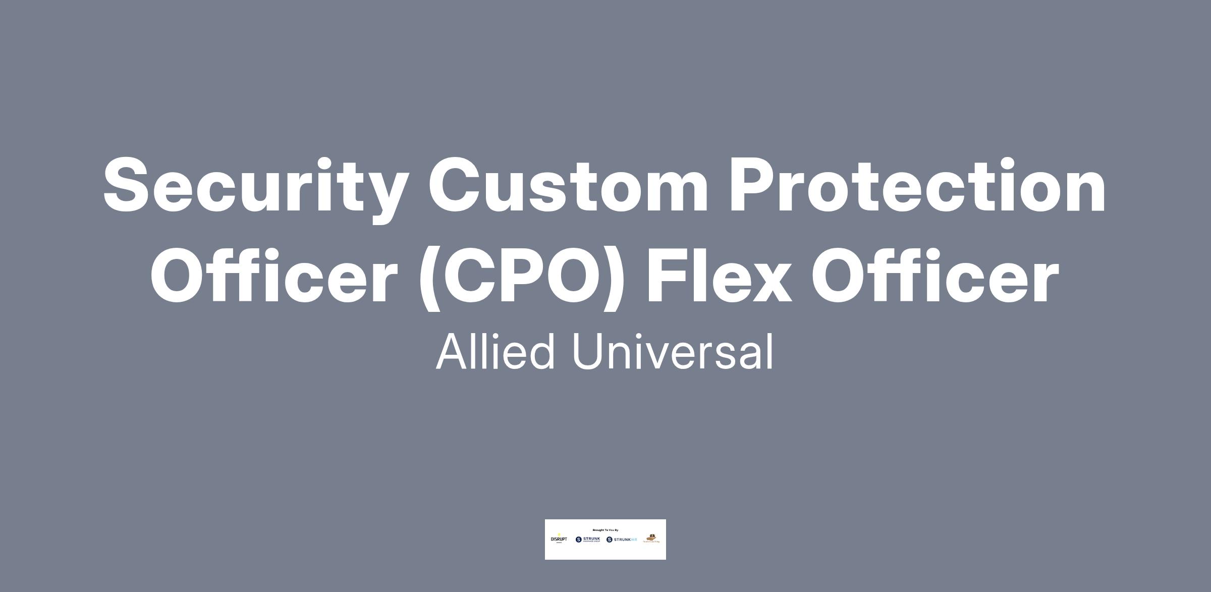 Allied Universal® is hiring a Custom Protection Officer (CPO) Flex Officer. The Custom Protection Officer Flex Officer will conduct armed and/or unarmed foot and/or vehicle patrol (interior and/or exterior). Additional duties include control access and egress; monitor CCTV and alarm systems; compose reports; deter criminal activity and misconduct. The Custom Protection Flex Officer will work at various assignments and may be called upon to work irregular shifts at times with little to no advance notice.