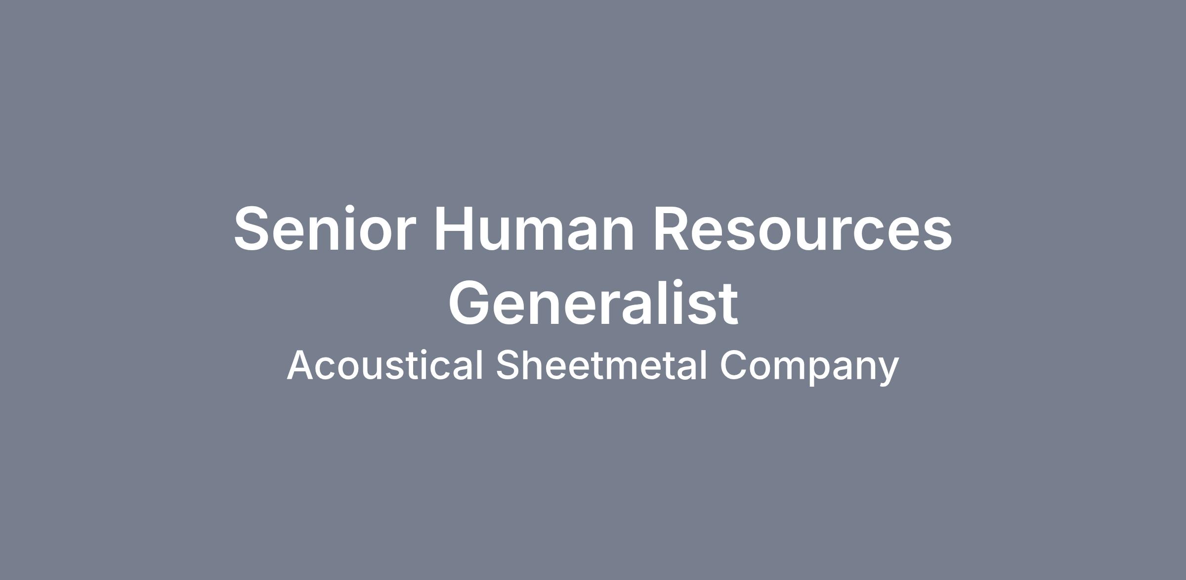 Acoustical Sheetmetal is seeking a dynamic and Senior HR Generalist to play a vital role in supporting the day-to-day operations of our Human Resources department. This position is key to ensuring a positive and productive workplace, where employees feel supported and policies are consistently upheld. We’re looking for someone who’s passionate about people and ready to contribute to a growing, hardworking team. The hours for this position are 8am –5pm, Monday through Friday. The candidate will provide HR support for our first shift employees. The role will require flexibility to support both of our manufacturing plants located in Virginia Beach as needed.