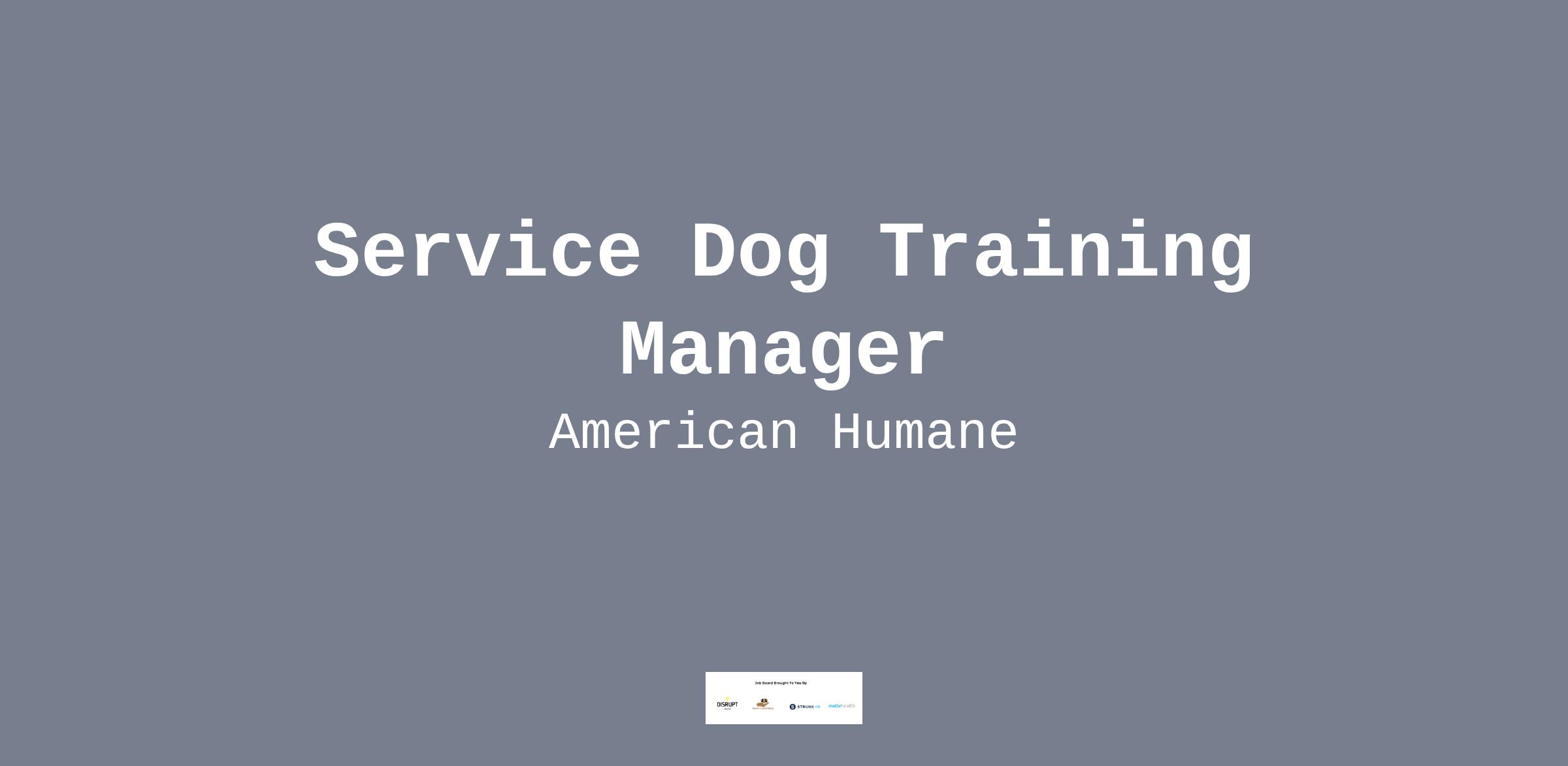American Humane Society is seeking an experienced Service Dog Training Manager in South Florida. This position will be on-site and reports directly to the Director, Sanctuary and Military Affairs Programming. American Humane Society is committed to fostering a welcoming workplace. As we seek to fill this position, we encourage high-performing applicants from all backgrounds to apply.